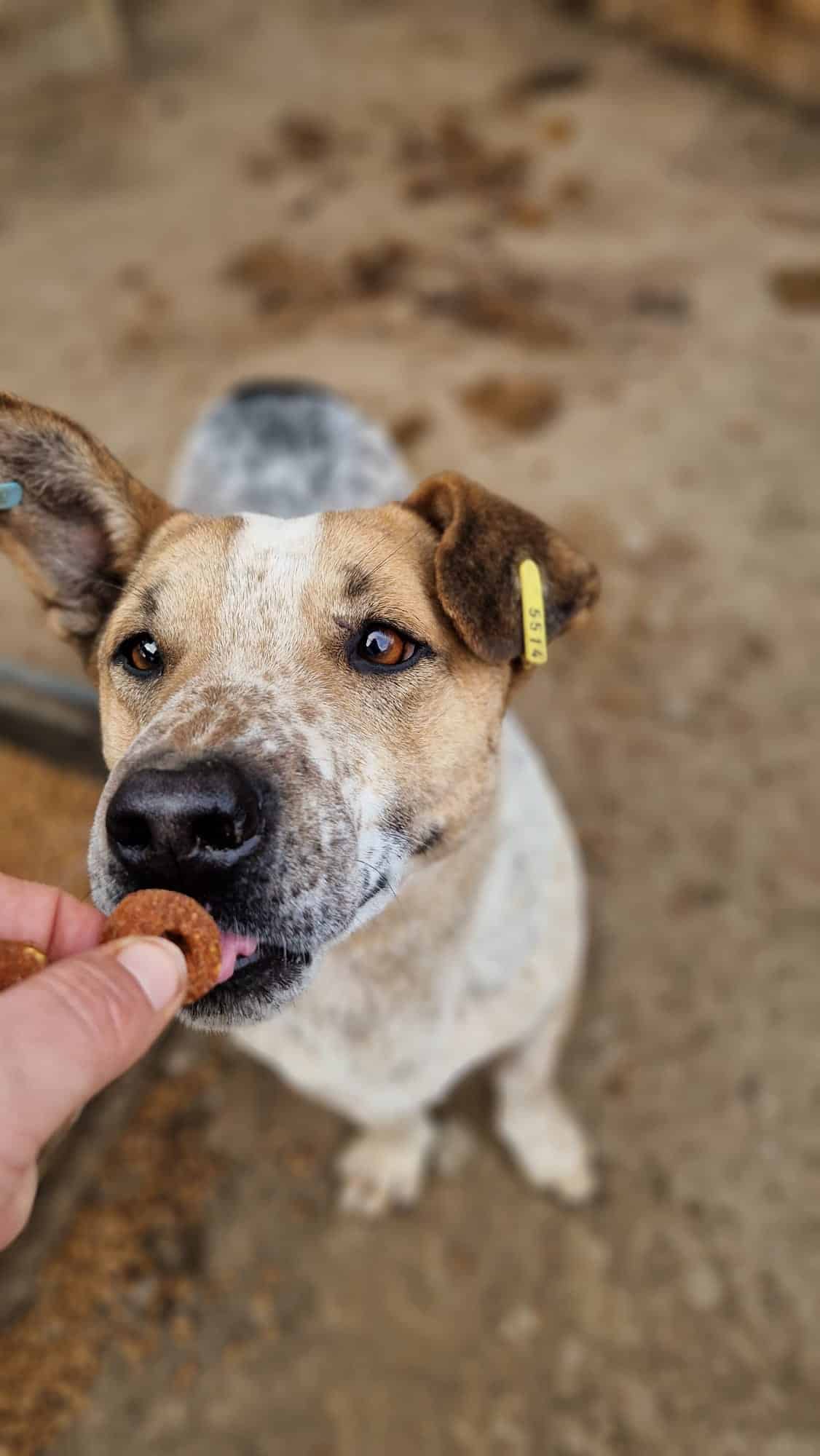 als wir vor dem Kennel standen, hat er uns zunächst verbellt. Als er merkte, dass wir tolle Leckerlis haben, hat er sich schnell beruhigt und fand uns interessant,