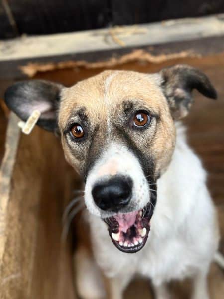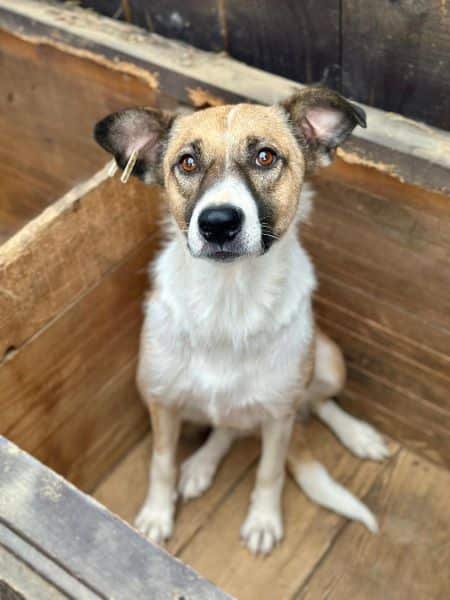 Schwierige Situation für diese zutrauliche Hündin in ihrem Kennel. Überwiegend größere Hunde, die an für sich auch O.K. sind, aber uns die Möglichkeit nahmen, uns in Ruhe mit der Süßen zu beschäftigen. Da wir ihren Stand im Rudel nicht kennen, schoben wir sie auch nicht aus der Hütte. Zu schnell entwickelt sich dann in einer Hundegruppe eine Dynamik, die man nicht haben möchte. Zu versuchten wir sie in der Hütte kennen zu lernen, was auch prima ging. Leckerchen findet sie klasse, nimmt sie problemlos aus der Hand und nach kurzer Zeit streichelten wir sie bereits. Alles ohne Stress und Hektik. Das tat ihr gut. Sie hatte früher sicherlich einmal Welpen gehabt. Schnell würde diese Hündin in einem Zuhause auftauen. Sie wird grundsätzlich verträglich sein.