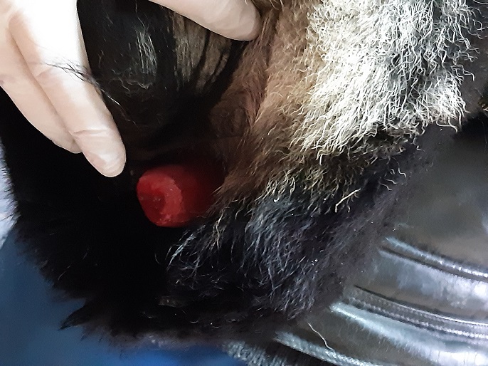 Medizinischer Notfall: Rute wurde abgerissen und Anus verletzt, 2-facher Prolaps (Darmaustritt) musste jeweils behandelt/operiert werden, insgesamt 6 Monate in Behandlung gewesen
