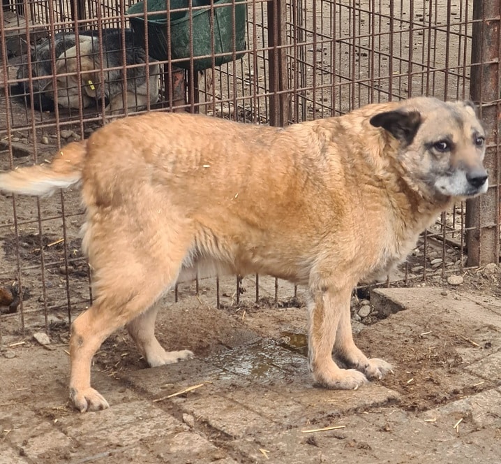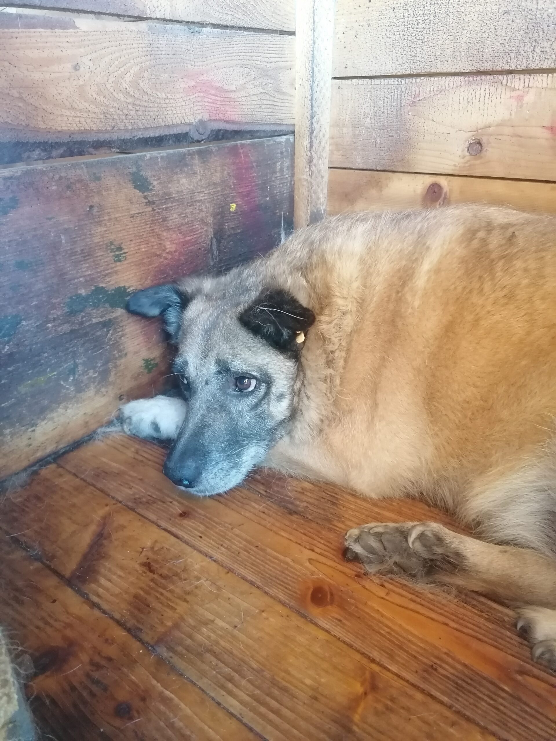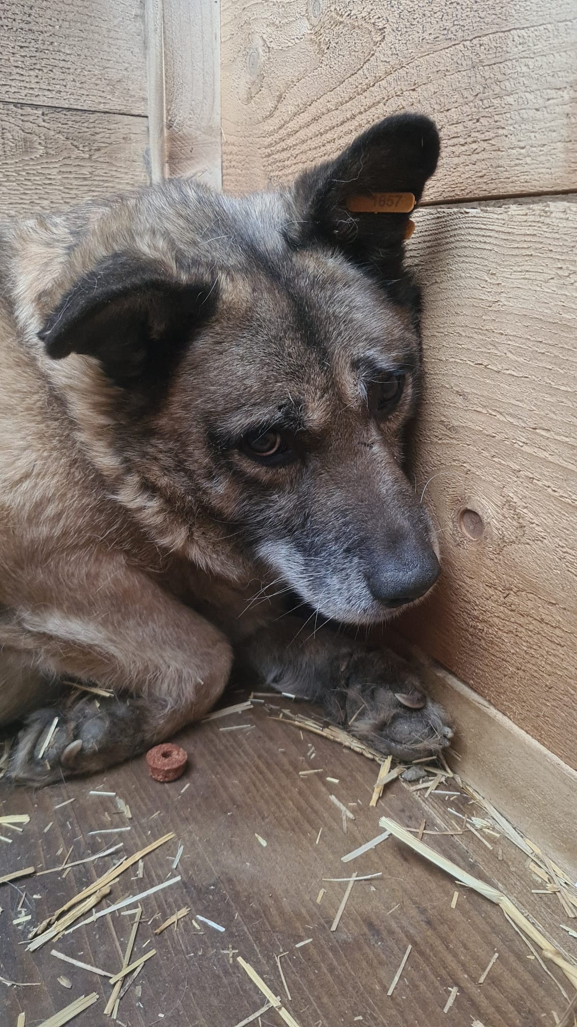 ANOUK ist ein ängstlicher und unsicherer Rüde. In seiner Hütte fühlte er sich sicher vor den anderen Hunden im Kennel und vor uns. Kommt man ihm näher, versucht er, den Kopf abzuwenden und auszuweichen, damit er einen nicht anschauen muss. Sein Gangbild ist nicht gut, er läuft schlecht.