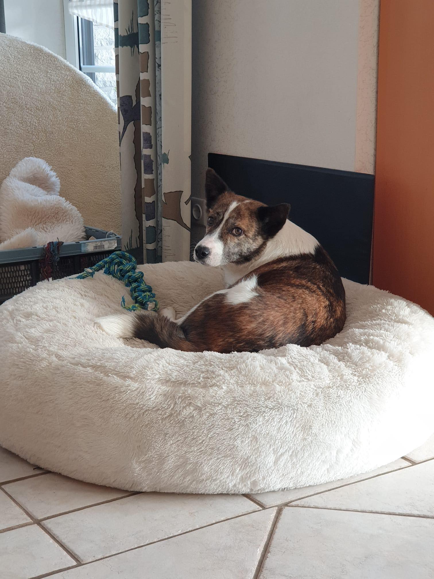 Sie ist eine ruhige Hündin und liebt ihr kuscheliges Körbchen über alles. Dort schläft sie viel, aber genauso beobachtet sie von hier aus auch was um sie herum geschieht.