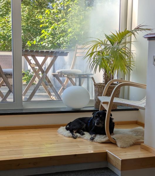 Zuhause ist er ein angenehmer Mitbewohner, der keine Hektik macht und gut zur Ruhe kommt, so dass das Zusammenleben mit ihm sehr entspannt ist. Er zeigt bisher auch kein territoriales Verhalten, so dass Besucher bei ihm immer willkommen sind.