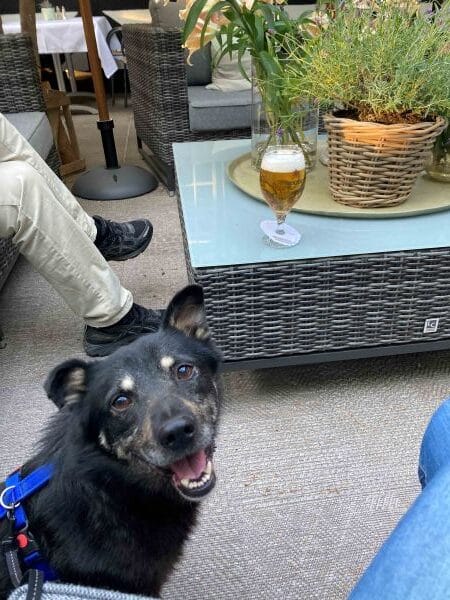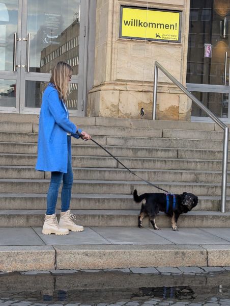 Auf Spaziergängen in der Stadt ist er souverän unterwegs und zeigt keine Unsicherheiten. Restaurant- oder Biergartenbesuche etc. sind mit ihm problemlos möglich.