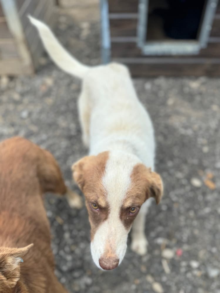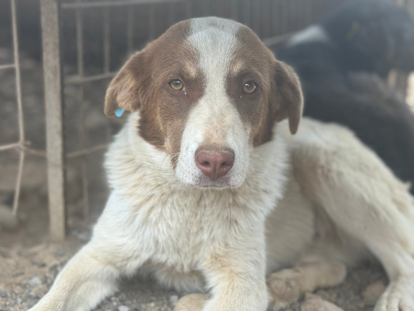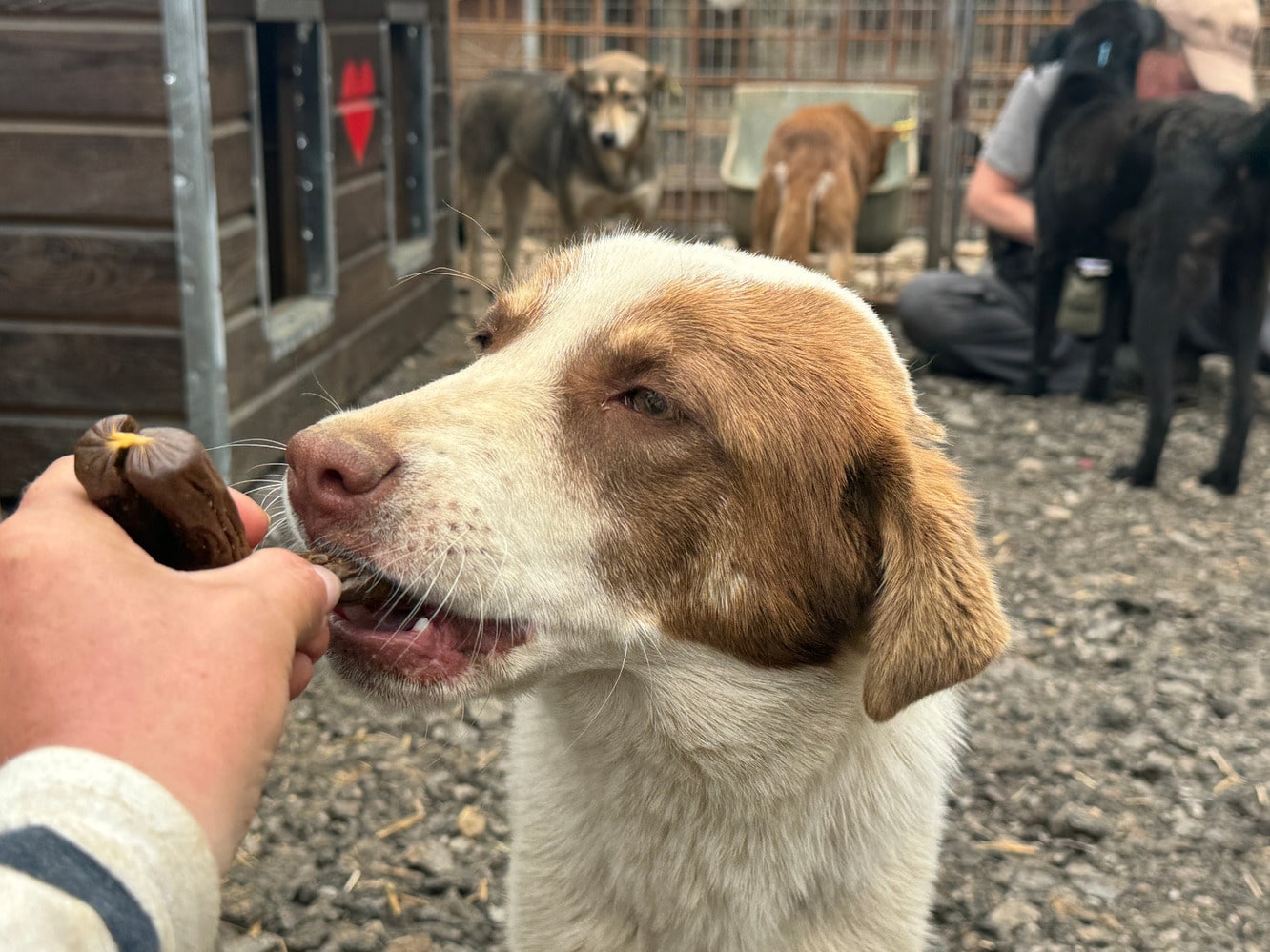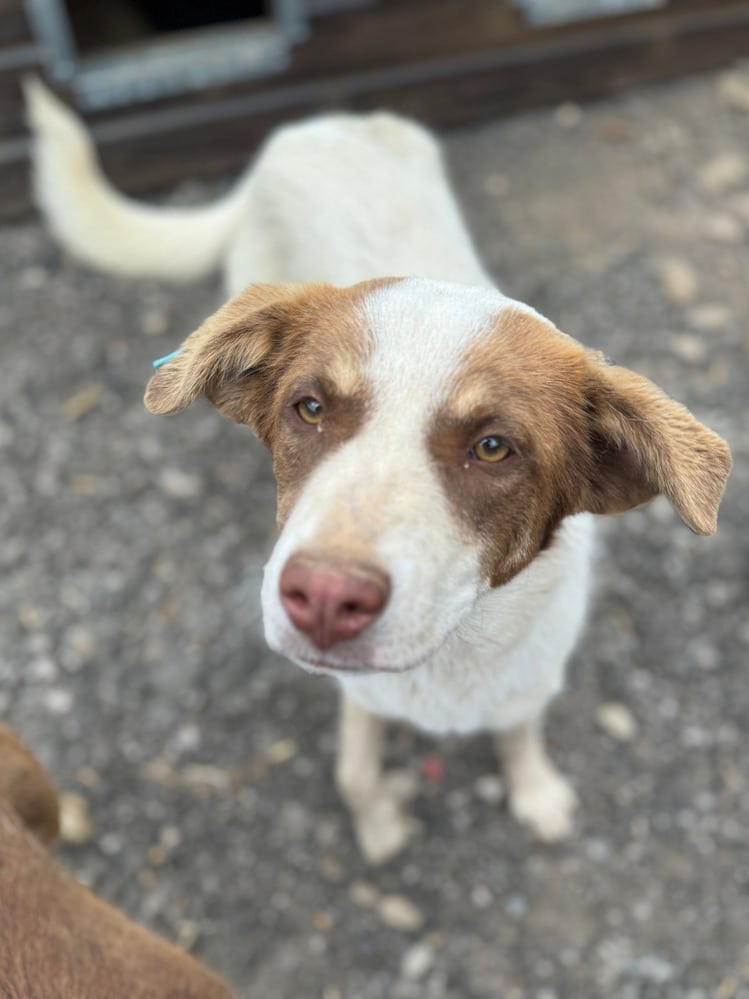 Wunderschöne weiß-braune Hündin, sehr freundlich und neugierig. Unsere Leckerchen hat sie gerne angenommen und am liebsten alle für sich beansprucht. Sie zeigt sich leicht eifersüchtig, aber mit guter, klarer Kommunikation. Als die anderen Hunde im Kennel an der Reihe waren, hat sie sich ganz ruhig in die Ecke gelegt.