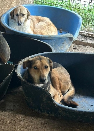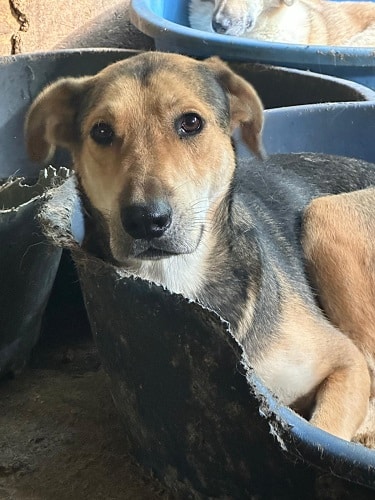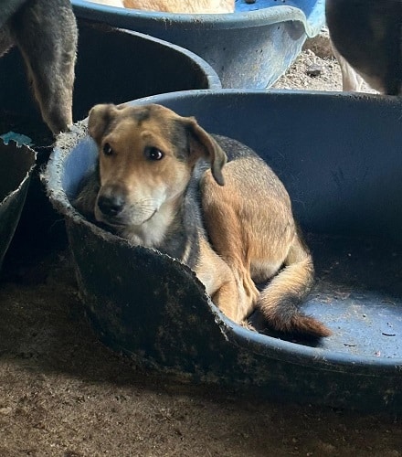 Update 10/23: Arnie ist ein sehr hübscher Bub geworden. Er lag während unseres gesamten Besuches völlig relaxt im Futtertrog und beobachtete unser Treiben. Erst zum Ende wandten wir ihm unsere Aufmerksamkeit zu. Das verunsicherte ihn etwas, aber ließ sich dennoch gut anfassen. Mit etwas Eingewöhnungszeit sowie ausreichend Hundeerfahrung kann man ihn noch gut an ein Familienleben gewöhnen. Als wir ihn nicht mehr bedrängten, zog er es doch vor, seine gechillte Position im Futtertrog zu verlassen und Raum zwischen sich und uns zu gewinnen. Ein souveräner Zweithund würde ihm helfen.