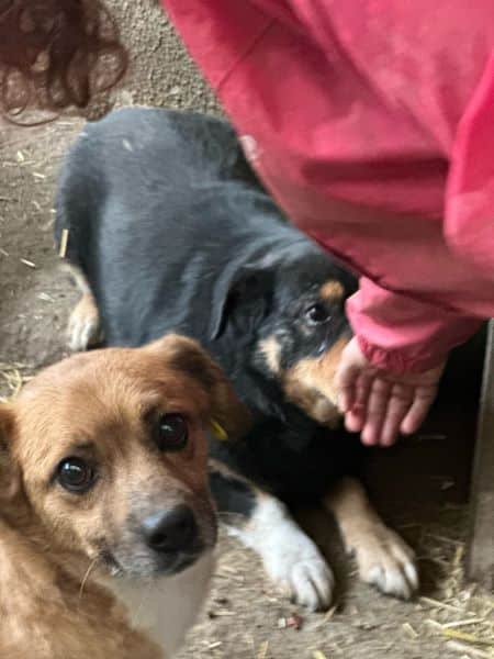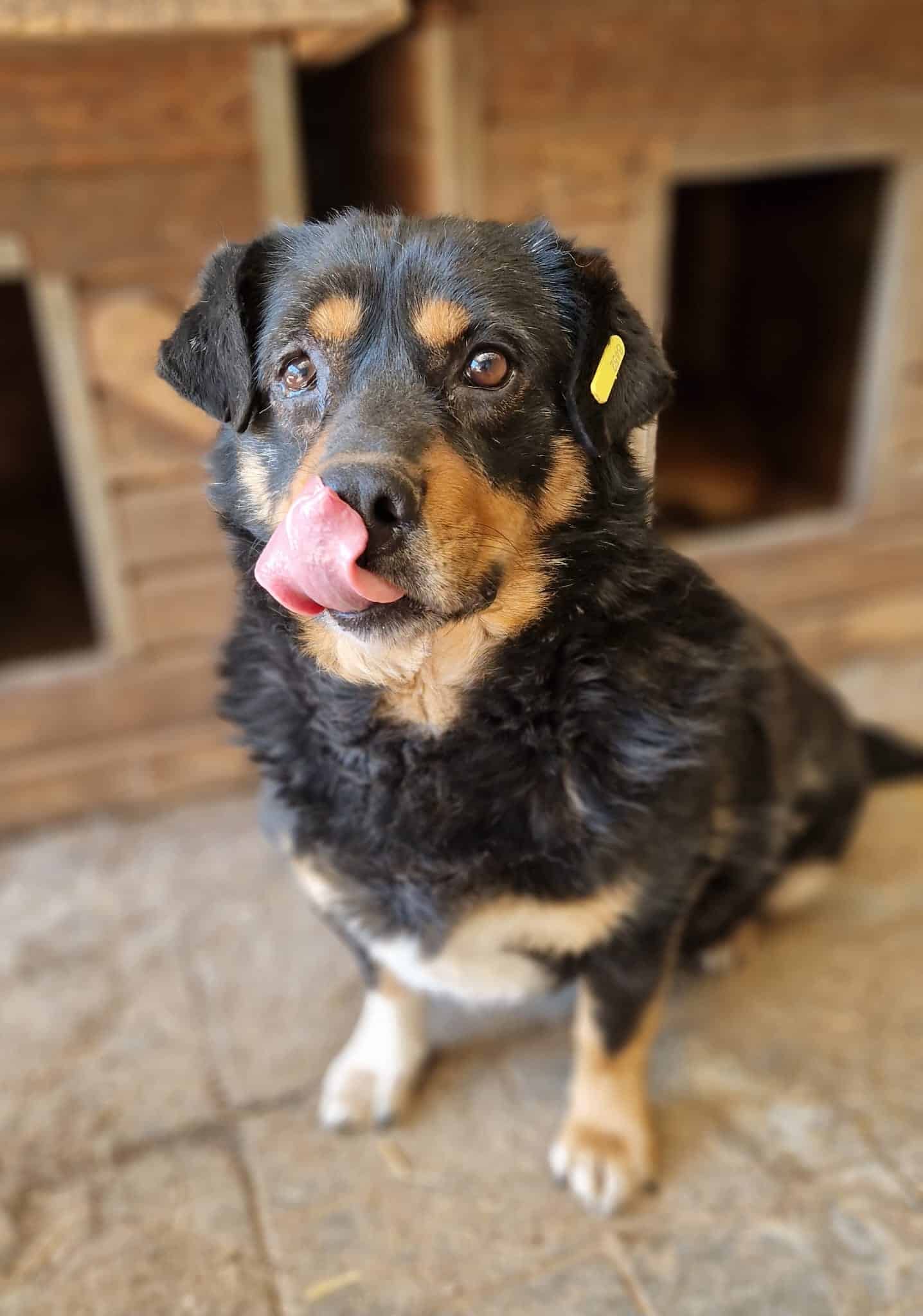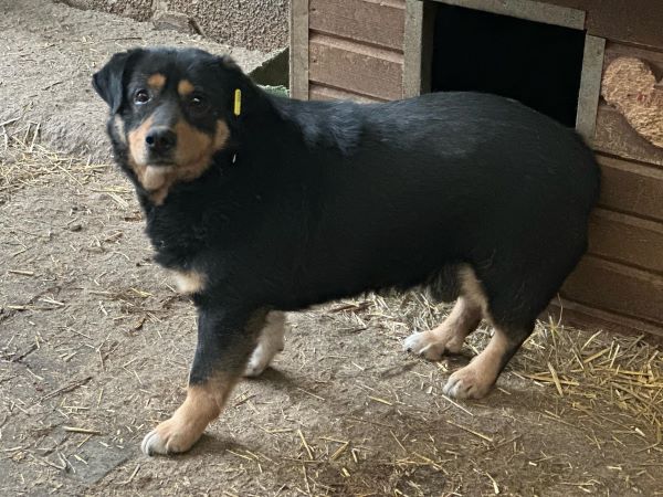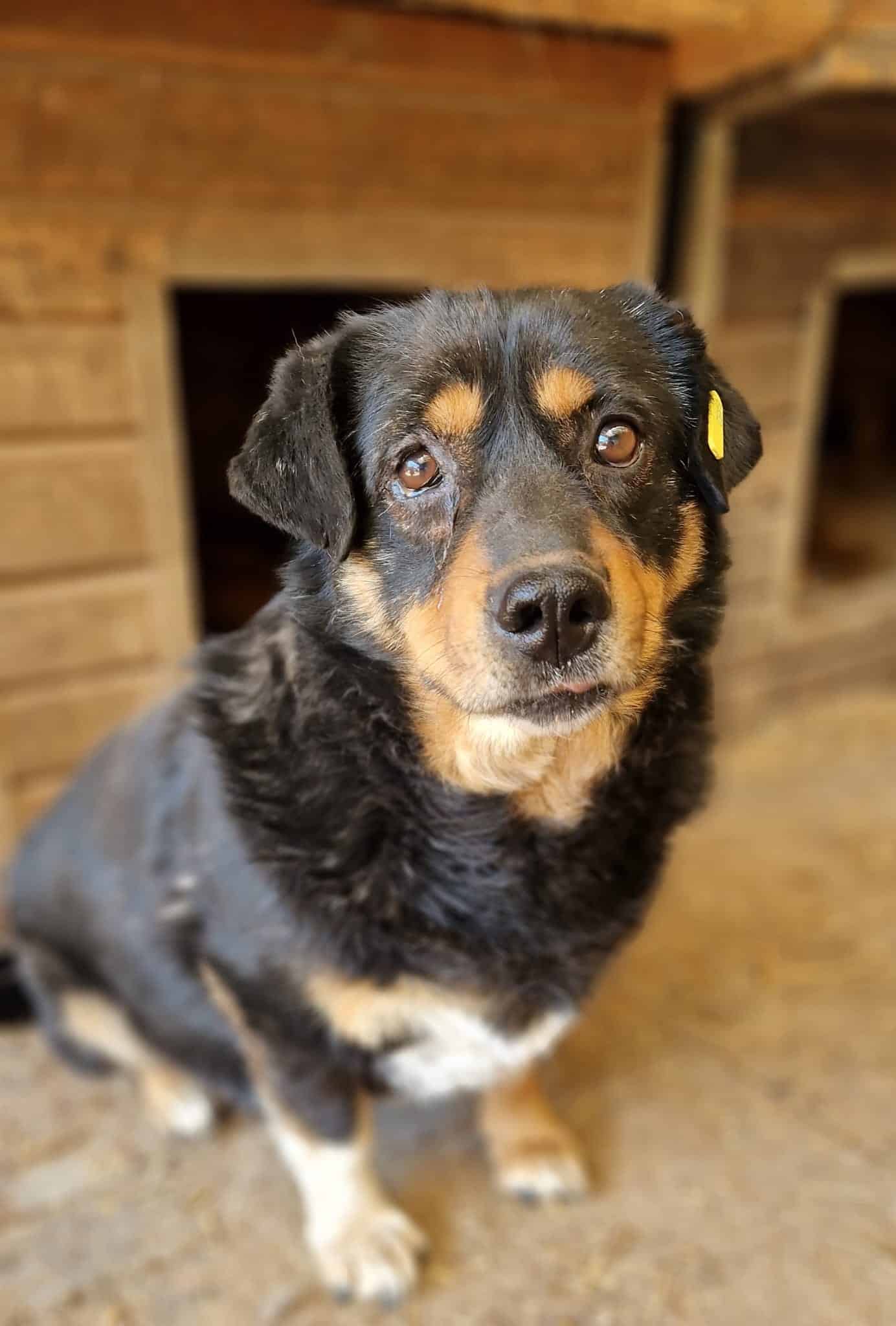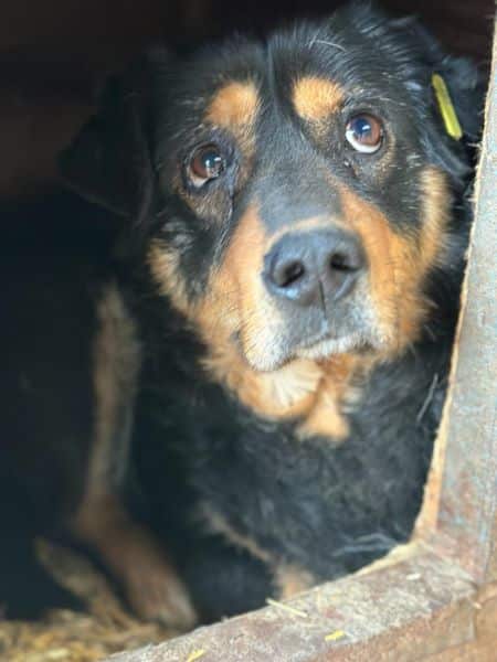 ARPAD schaute uns die ganze Zeit sehr neugierig aus der Hütte zu. Leckerchen nahm er sofort, aber zu mehr fehlte ihm der Mut. Wir konnten ihn dann doch überreden kurz einmal raus zu kommen, in dem wir Leckerchen um die Hütte herum warfen. Also zu Futter kann er schlecht nein sagen, was man aktuell auch sieht. Aufgrund der Shelterlangweile und weil niemand die Futtermenge vor Ort einzeln managen kann, ist er zu dick geworden. Er braucht dringend Menschen, die ihn wieder auf schmalere Kost setzen und langsam mit ihm den Bewegungsapparat wieder trainieren. Er muss ja kein Hochleistungssportler mehr werden – etwas gemütlich dürfte es wohl bleiben.