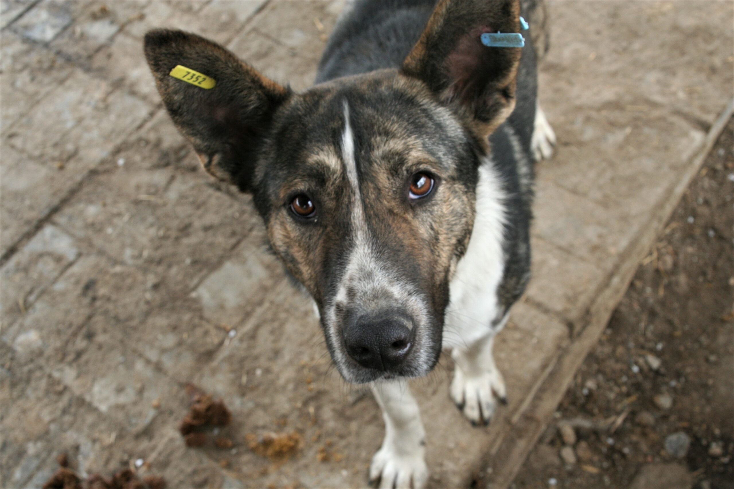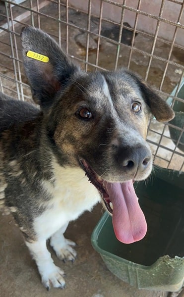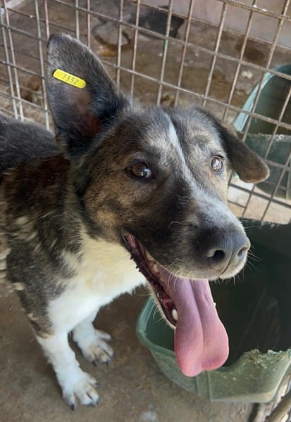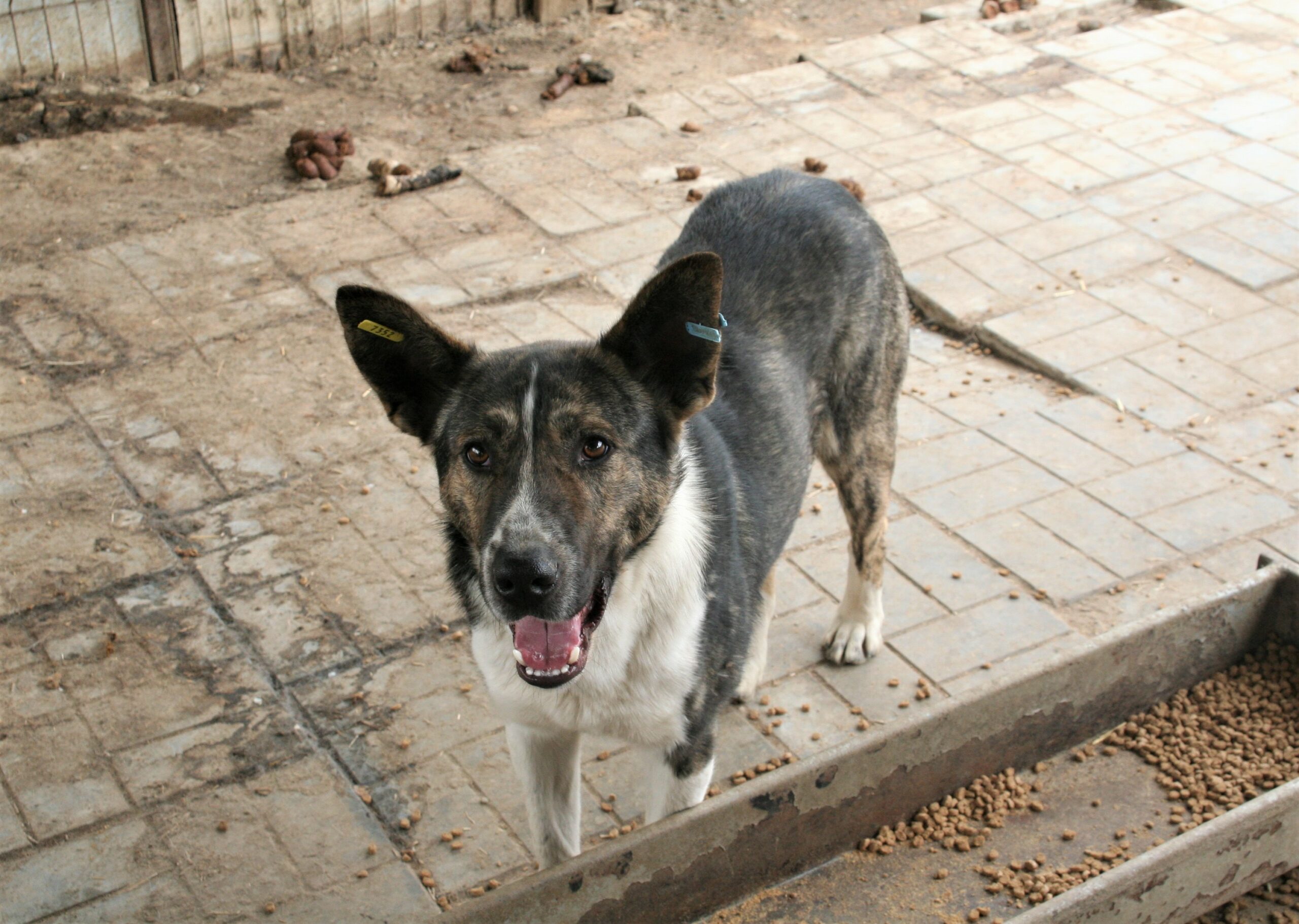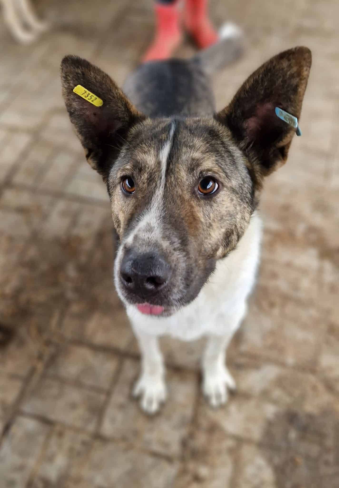 Askor sitzt im Außenbereich des Vetkennels. Der hübsche Rüde ist vollkommen unausgelastet. Freudig und distanzlos hüpfte er an uns hoch als wir den engen Kennel betraten. Nach kurzer Zeit und Korrektur beruhigte er sich.
