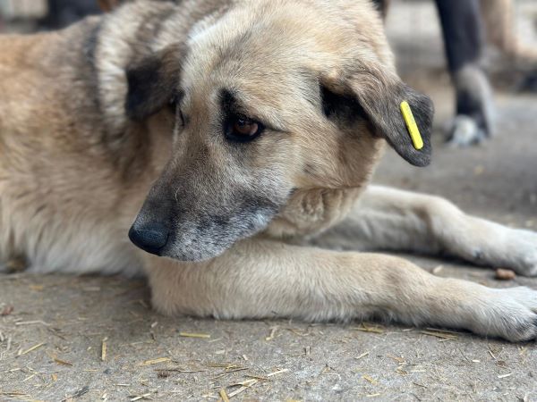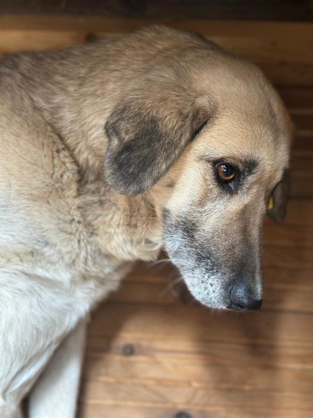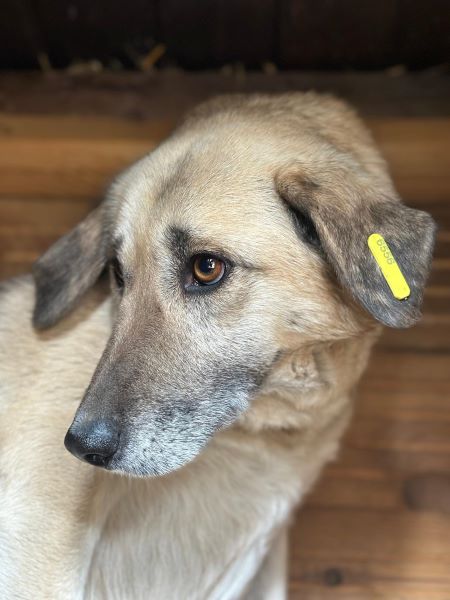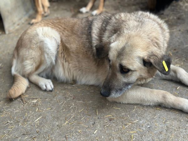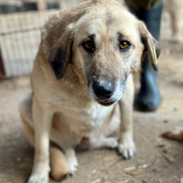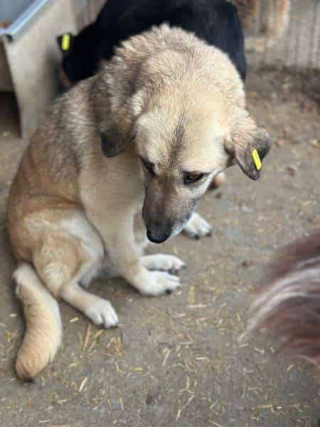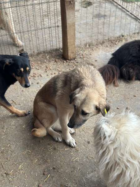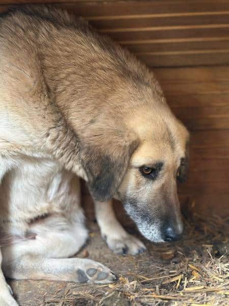 Absoluter Notfall ist diese wunderbare Hündin, die unser Herz berührt hat. Zusammengekauert in der Hütte fanden wir sie. Als wir sie aus der Hütte drängten, wurde leider klar, dass diese Hündin leidet. Sie sitzt wohl quasi auf ihren Pfoten, um gehen zu können. Wir sind keine Mediziner und ohne Röntgen wird man auch nicht wissen, was alles los ist. Wir können uns eine sehr schwere Patellaluxation vorstellen. Genaue Diagnose und wie man ihr helfen kann, müsste in Deutschland erfolgen. Hoffentlich sieht jemand diese ausgesprochen nette, verträgliche Hündin, die sich gerne überall anfassen lässt und uns sogar ihr Bäuchlein zum Kraulen zeigte. Sie wird früher einmal Welpen gehabt haben.
