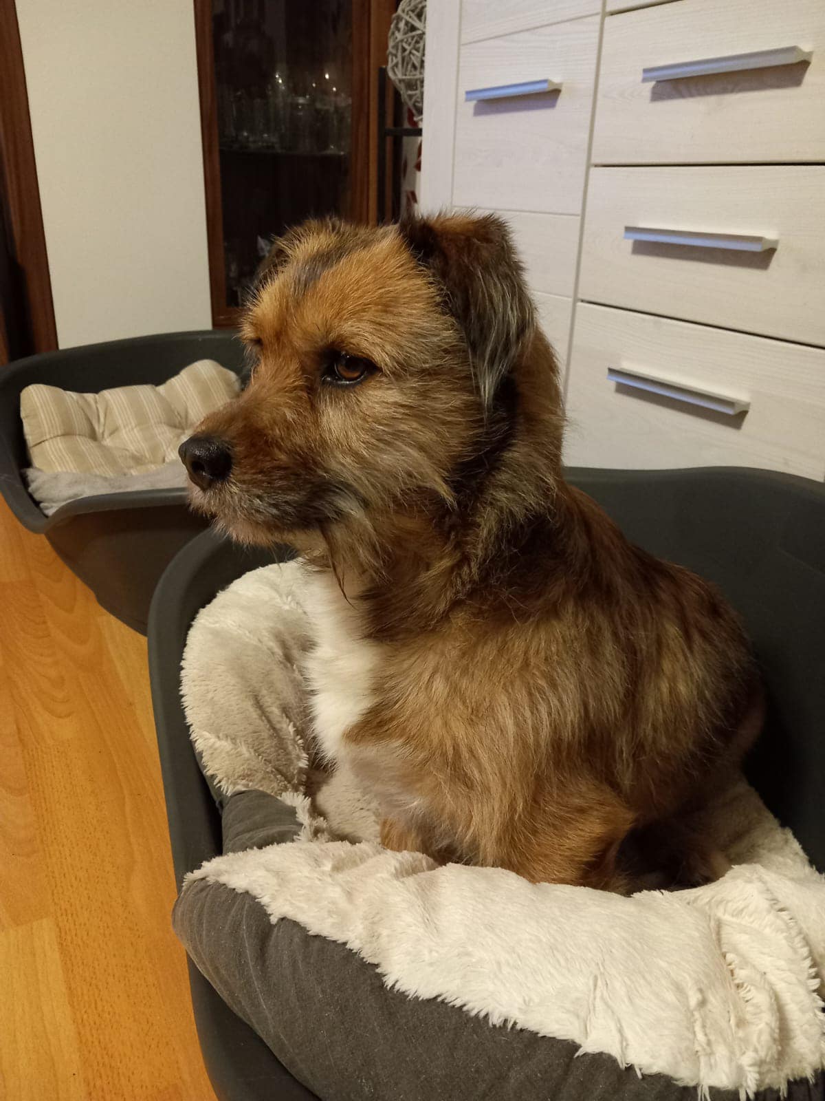 Bei der Katze unseres Familienmitgliedes hat er ruhig und unbeeindruckt reagiert. Er ist eher ein ruhiger Zeitgenosse und liegt viel im Körbchen, er kann aber auch seine spielerischen 5 Minuten haben, sein wahrer Charakter zeigt er immer mehr.