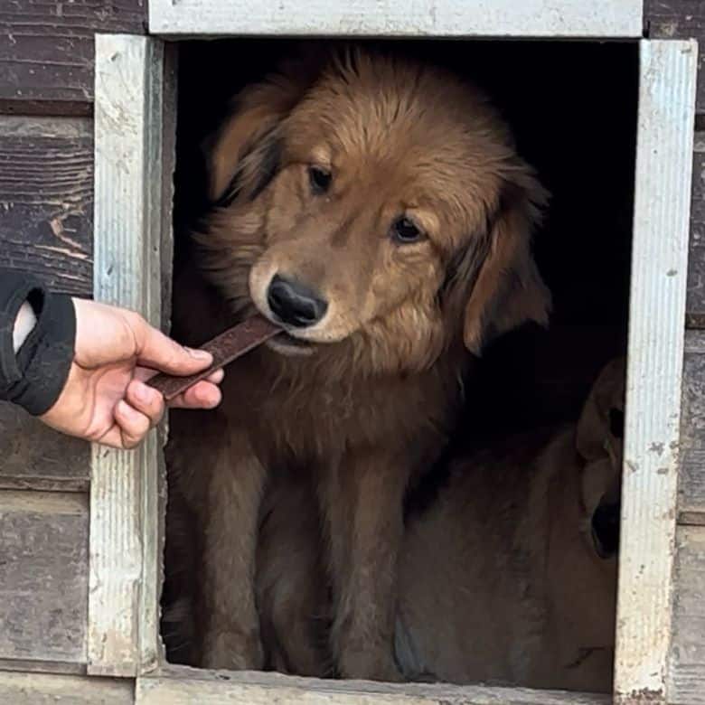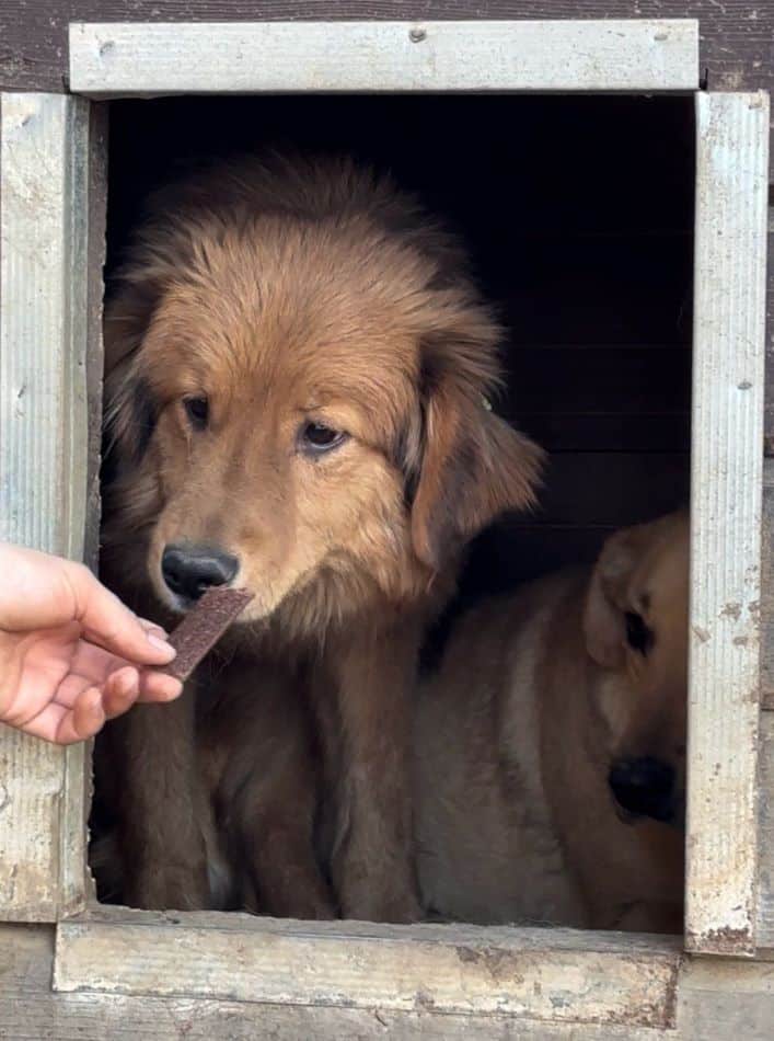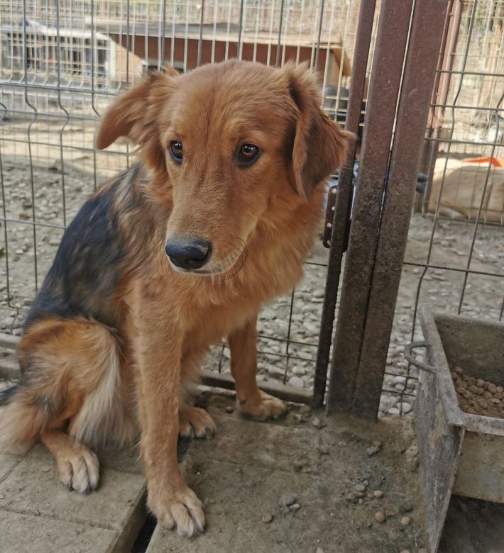 Diesem sanften und wunderhübschen Rüden war unser Besuch leider nicht ganz geheuer. AYK hielt sich lieber im Schutz der Hütte auf und ließ den anderen Hunden den Vortritt, sich Streicheleinheiten und Leckerlie abzustauben. Als wir uns ihm in seinem Versteck zuwandten, nahm AYK dann doch gern unser mitgebrachtes Futter direkt aus der Hand und fraß auch in unserer Anwesenheit. Bei unseren Berührungen wich er zurück und versuchte, noch tiefer in die Hütte zu kriechen. Menschliche Nähe scheint ihm leider absolut nicht vertraut zu sein und so wusste er nicht, ob wir es auch wirklich gut mit ihm meinten. Dieser nette Kerl sucht ein liebevolles Zuhause bei erfahrenen Menschen, die ihm mit Feingefühl und Geduld begegnen und ihn in seinem Tempo ankommen lassen, damit AYK Auftauen und sich fallen lassen kann. Ein aufgeschlossener Ersthund würde ihm diese Umstellung sicher erleichtern.