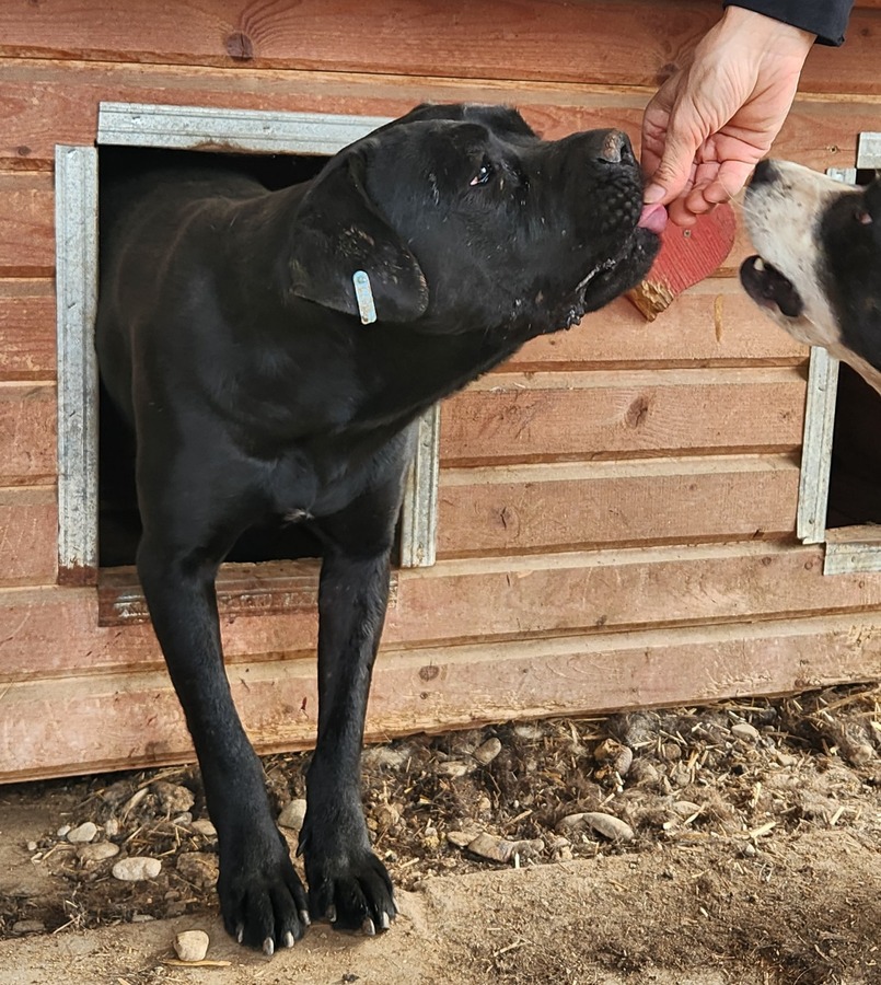 Das hübsche Hundemädchen BALLERINA lag in der Hütte, als wir den Kennel betraten. Die angebotenen Leckerchen nahm sie dankbar an, sodass wir sie dann sogar aus deren sicheren Schutz herauslocken konnten, um noch mehr leckere Kaustangen zu ergattern. Berühren lassen wollte sie sich jedoch noch nicht. Mit ihrer Kennelkollegin scheint sich BALLERINA gut zu verstehen. Auffallend waren für uns ihre tränenden Augen.