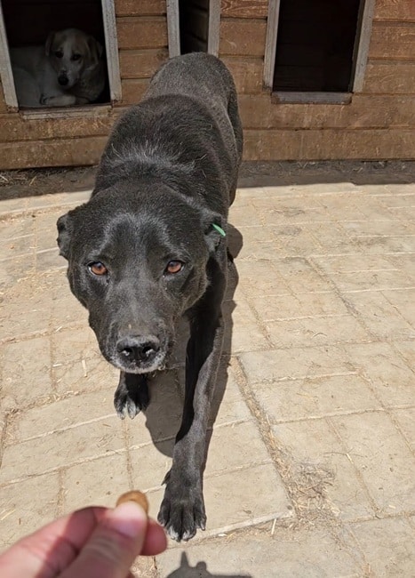 Dieser freundliche Rüde wartete geduldig in der zweiten Reihe während wir uns mit der Chefin im Kennel beschäftigten. Als wir uns ihm zuwandten, nahm er gerne unsere Leckerchen und kam neugierig zu uns. Anfassen konnten wir ihn nicht. Seine Unsicherheit überspielte er mit Spielaufforderungen. Balthazar hat mehrere abheilende und auch neue, frische Bisswunden. Ein netter Kerl, der in einer anderen Umgebung sicher rasch noch gut auftauen würde.