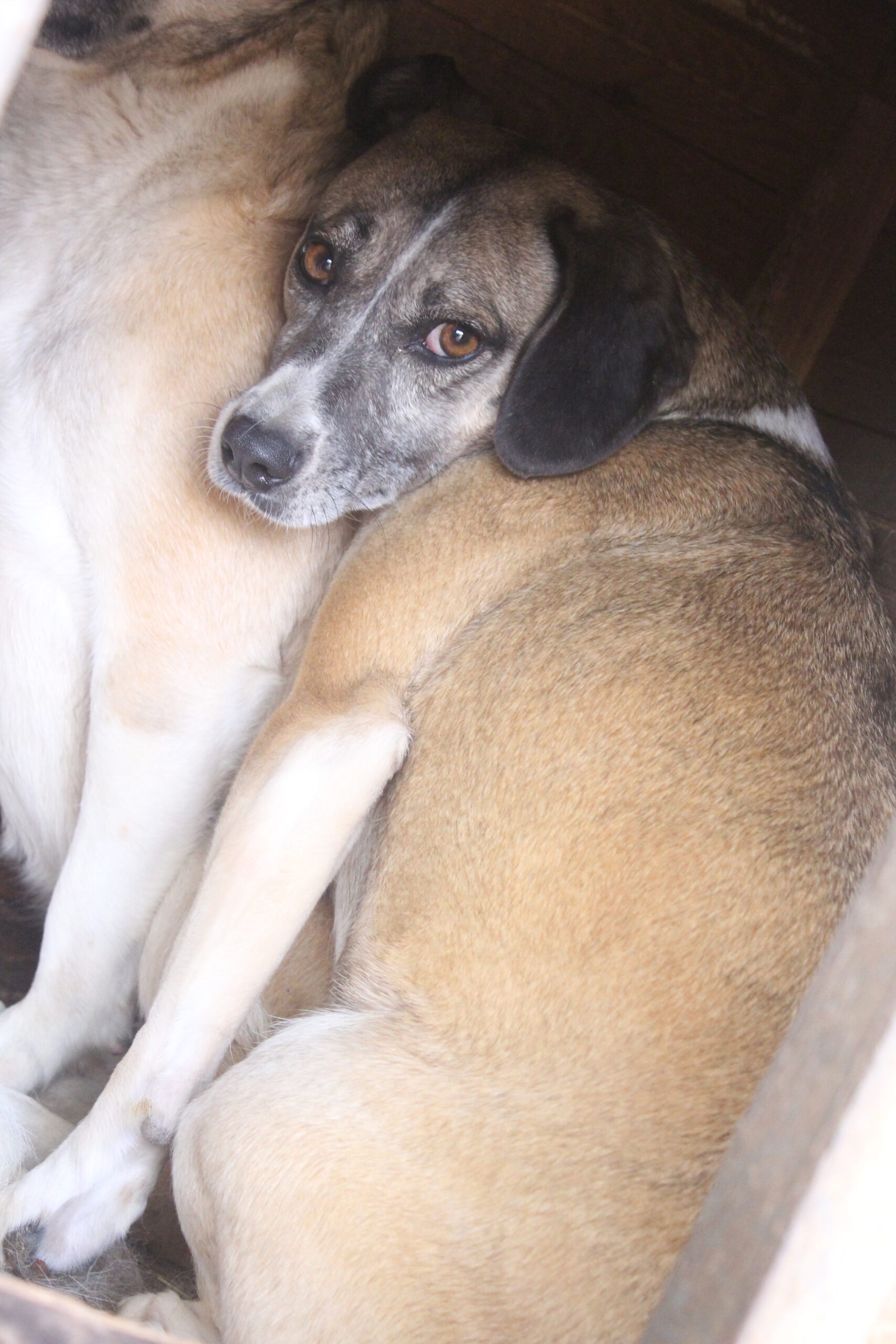 BANJA hat weiterhin Furcht vor uns Menschen und flüchtet lieber in die Hütte. Sie würde sich in solchen Momenten der Aufmerksamkeit am liebsten unsichtbar machen und versteckt sich dann auch gern hinter ihren Hundekumpels. In der Hütte konnten wir sie anfassen und streicheln. Genießen konnte sie es nicht. Sie blieb aber zu jeder Zeit defensiv und zeigte keinerlei Abwehrverhalten.