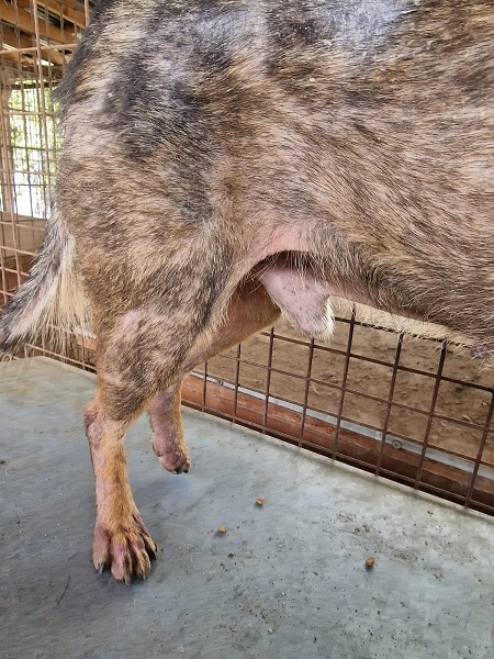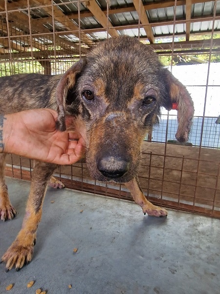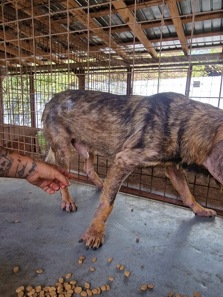 BEELO bietet einen erschreckenden Anblick und ist kaum wiederzuerkennen. Er leidet unter starken Hautproblemen und hat zudem große Probleme mit dem linken Hinterbein, welches er aktuell kaum nutzen kann. Er sollte dringend aus dem Shelter.