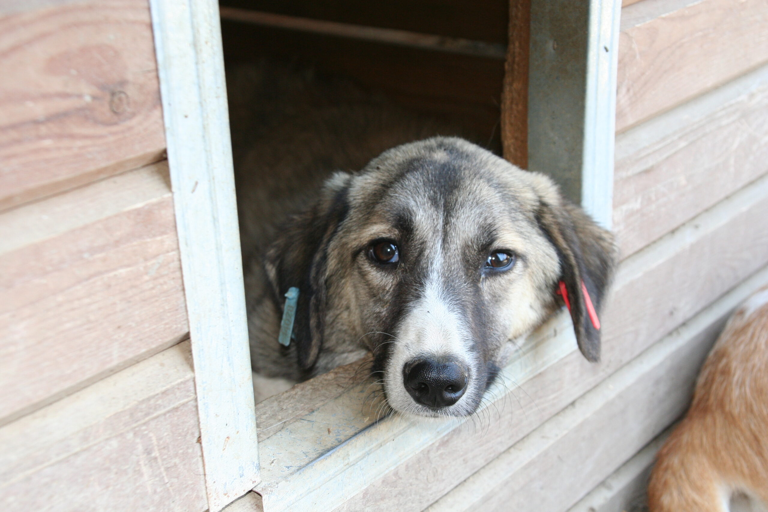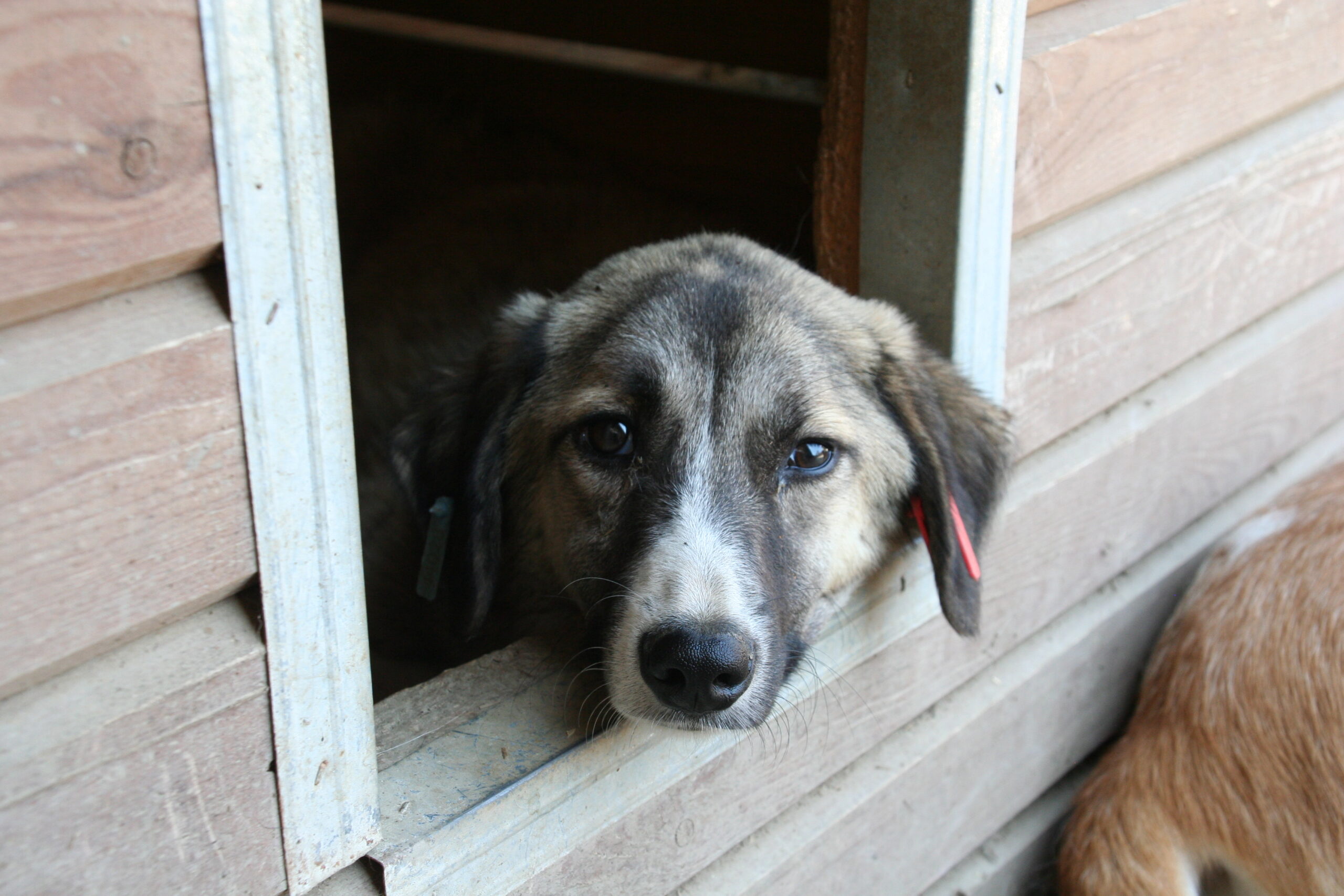 Die zarte BEENA betrachtete das Geschehen erst einmal aus der Hütte heraus. Sie ist wohl noch nicht so lange in diesem Kennel, denn sie scheint noch nicht richtig in die Hundegruppe integriert und überließ daher erst einmal den anderen den Vortritt.