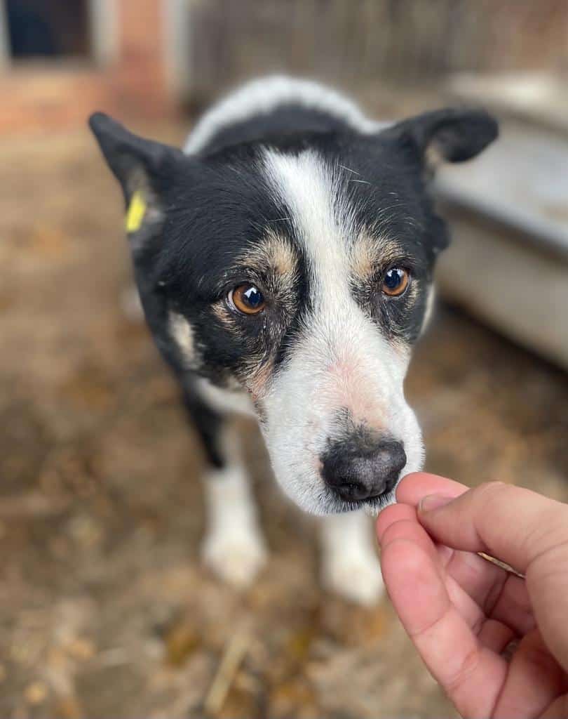 BELANA zeigte sich neugierig und interessiert. Sie ist unsicher, nimmt aber weiterhin Leckerlie aus der Hand.