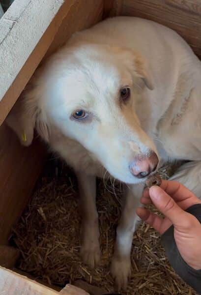 Die wunderhübsche BELE mit dem seidigen Fell entwickelt sich weiterhin als freundliche, aber sehr sensible Hündin. Sie nimmt Leckerchen mittlerweile gut aus der Hand, was ein kleiner, aber bedeutender Vertrauensbeweis ist. In ihrer sicheren Hütte lässt sich BELE problemlos anfassen, beginnt jedoch zu zittern, sobald man sie zu sehr bedrängt. Zu ungewohnt ist diese intensive Nähe noch für die sensible Maus. Außerhalb der schützenden Hütte fühlt sich BELE weniger sicher und weicht unseren Annäherungsversuchen lieber aus. BELE ist eine zurückhaltende Seele, die dringend ein ruhiges, geduldiges Umfeld braucht, um Vertrauen in kleinen Schritten aufbauen zu können. Für sie suchen wir erfahrene Menschen, die sie behutsam an die Pfote nehmen und ihr das Leben auf der Sonnenseite zeigen. Von einem souveränen Ersthunde würde BELE sehr profitieren.