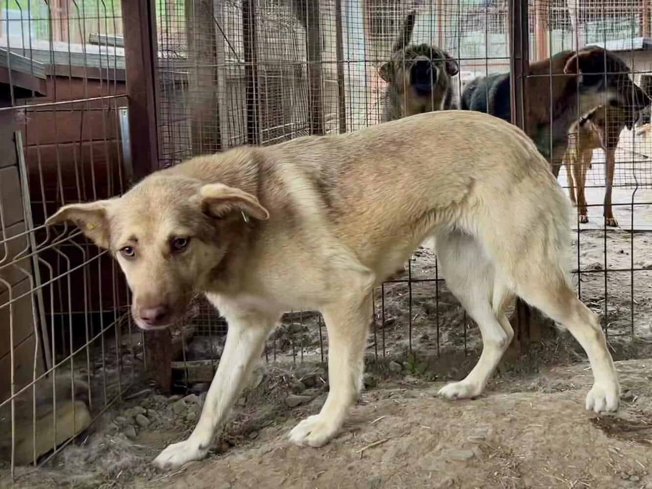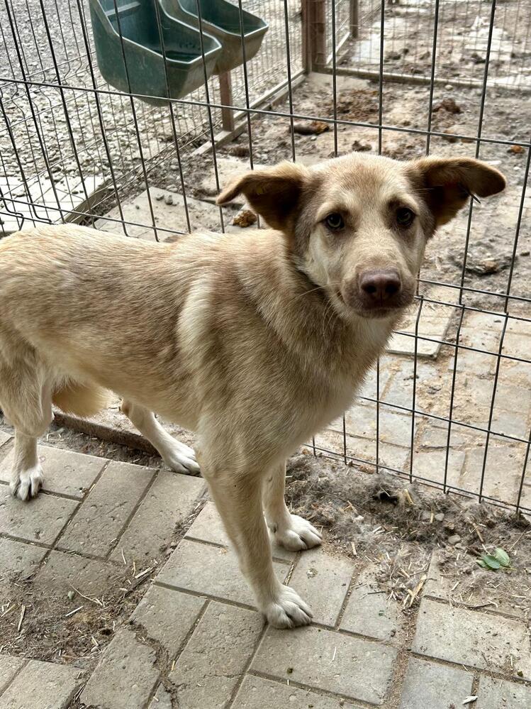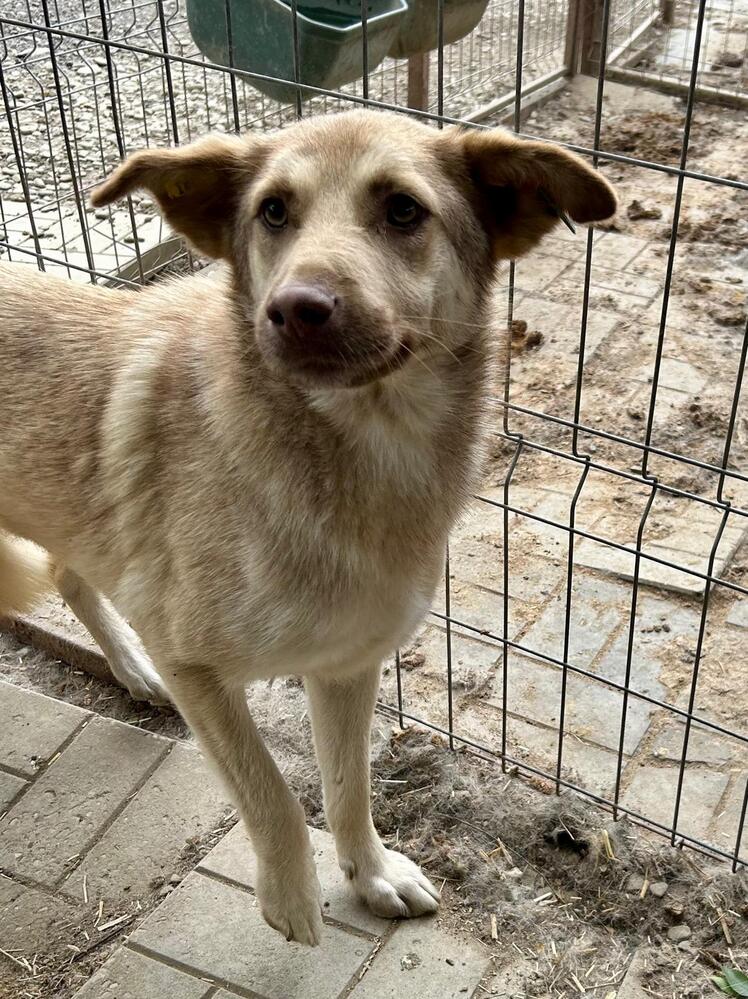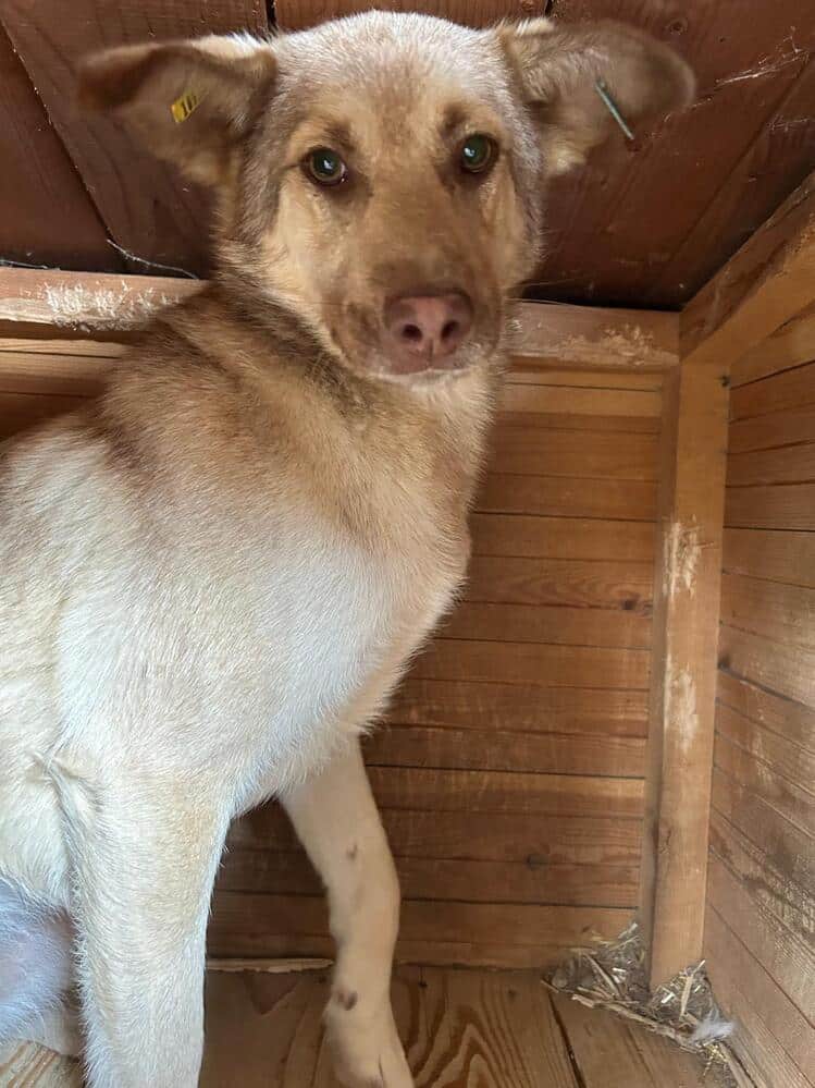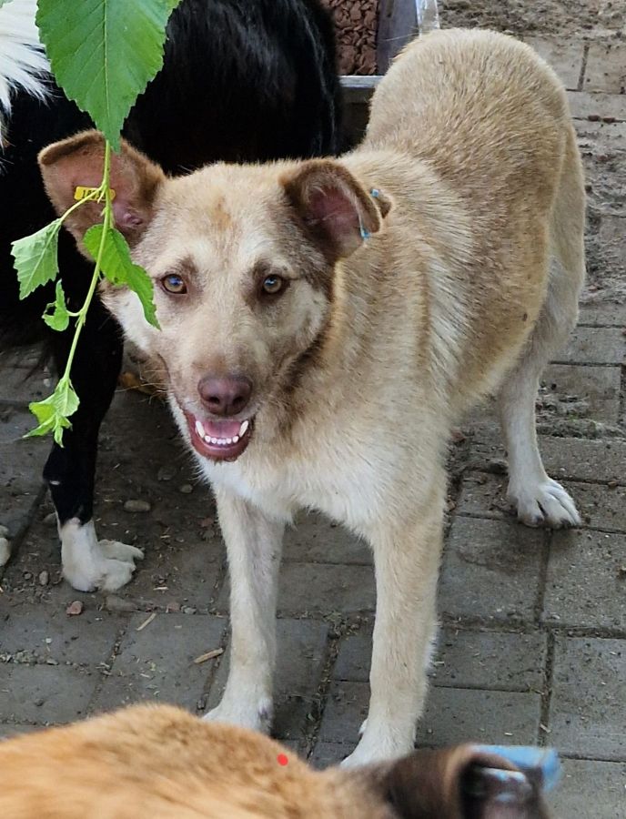 Diesmal trafen wir BELLADONNA draußen an. Sie zeigt sich weiterhin etwas scheu. Zweithund wäre ein Muss. Sie wirkt sehr verträglich. Anfassen konnten wir sie nicht und haben sie auch nicht bedrängt. Eine Verdickung am Sprunggelenk, die im Mai da war, konnten wir nicht mehr feststellen.