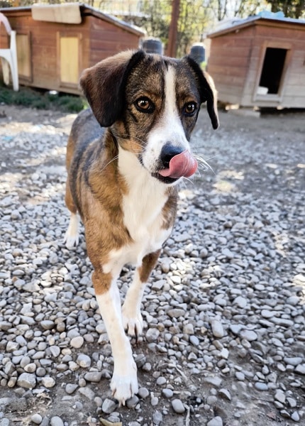 BELLIA wird nachts zu ihrer Sicherheit im Haus untergebracht. Tagsüber darf sie sich freilaufend draußen aufhalten. Sie zeigte sich uns gegenüber immer sehr neugierig und offen, nahm auch gerne Leckerli aus der Hand. Nur zum Anfassen fehlte ihr noch der Mut.