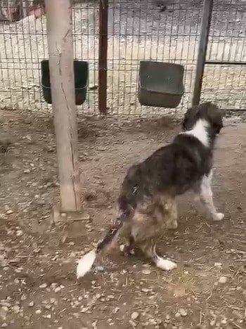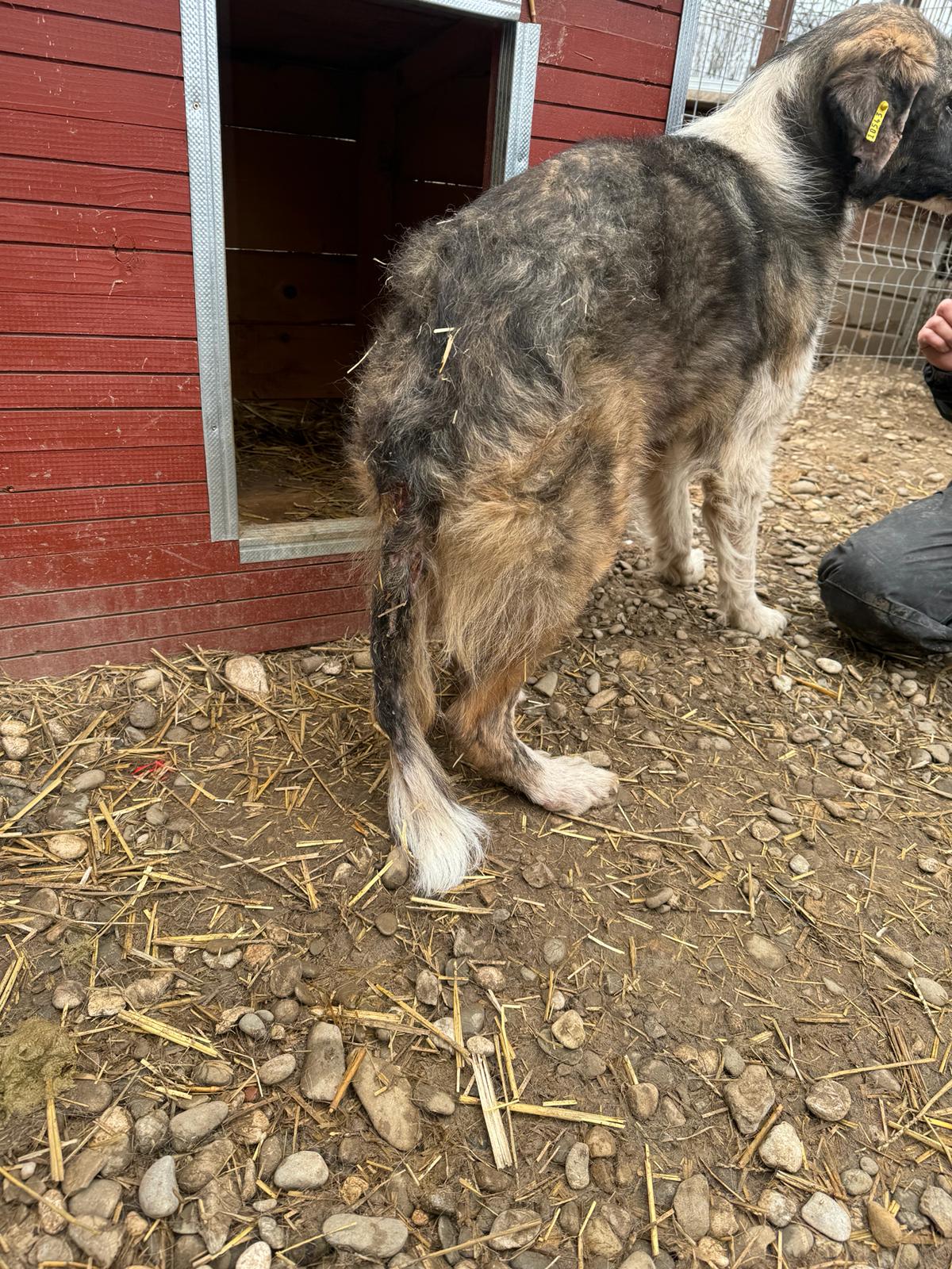 Als wir den Kennel am ersten Tag betraten, lag er zurückgezogen in seiner Hütte und wollte diese nicht verlassen. Als wir am nächsten Tag wiederkamen, schaute er bereits neugierig aus der Hütte zu einer Volontärin und näherte sich ihr schwanzwedelnd. Erst jetzt konnten wir erkennen, dass er sehr dünn ist. BENEDIKT weist große Probleme an seiner Hinterhand auf und ist zusätzlich durchtrittig, wodurch er sehr unrund läuft. Außerdem konnten wir offene Wunden an seiner Rute feststellen und er hat entzündete Augen.