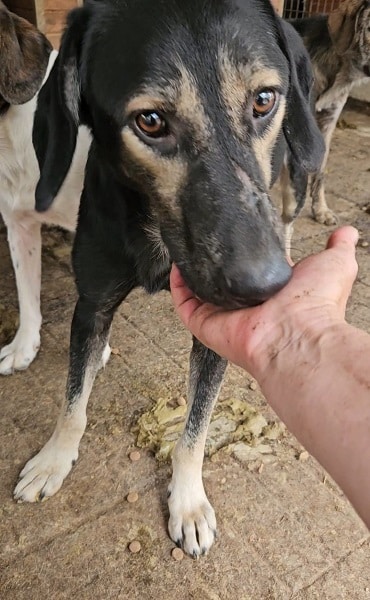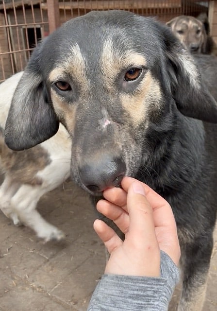 Der harte Shelteralltag hat bei BENNE Spuren hinterlassen. Die abheilende Wunde auf seiner Schnauze zeugen davon. BENNE freute sich sehr über unseren Besuch und wuselte zusammen mit den anderen Hunden neugierig um uns herum. Gerne nahm er unsere Leckerchen und war immer in unserer Nähe. Wir konnten BENNE zaghaft am Kopf anfassen. Für mehr fehlte ihm der Mut. In einer anderen Umgebung mit verständnisvollen Menschen, die zusammen mit ihm Vertrauen aufbauen, sollte BENNE noch gut auftauen. Seine neugierige Art und ein netter Ersthund würden ihm die Eingewöhnung sicher erleichtern.