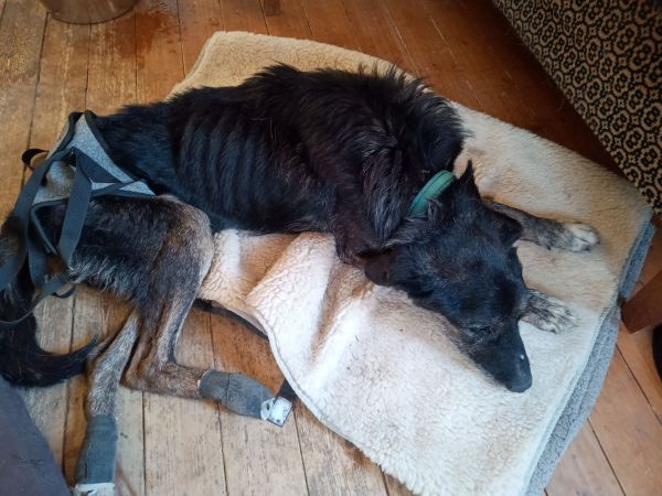 BENNIE wurde umgehend in die Klinik gebracht, mit einer OP und anschließender Chemotherapie konnte zwar der Tumor bekämpft werden, aber bereits in der Klinik trat eine Lähmung seiner Hinterbeine auf.