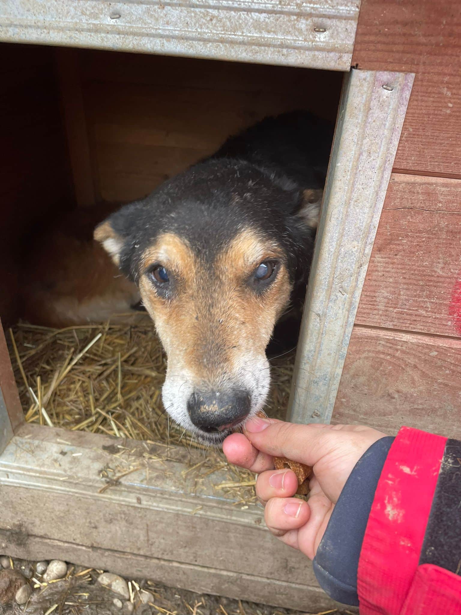 Der nette Opi ist inzwischen nicht mehr zu dünn. Um hungrigen Zeiten zu entgehen, hat er sich den Platz direkt im Futtertrog ausgesucht. Er ließ sich mit Leckerchen dennoch hervorlocken und kam zu uns. Wir konnten ihn überall anfassen; dabei bemerkten wir Einschnürungen am Hals. Was genau geschehen ist, kann keiner sagen. Die tiefen Einschnitte lassen denken, dass er lange, lange Zeit an der Kette verbracht hat. Es wäre so schön, würde er nun auf seine alten Tage auch ein warmes Körbchen und eine liebe Familie für sich gewinnen können.