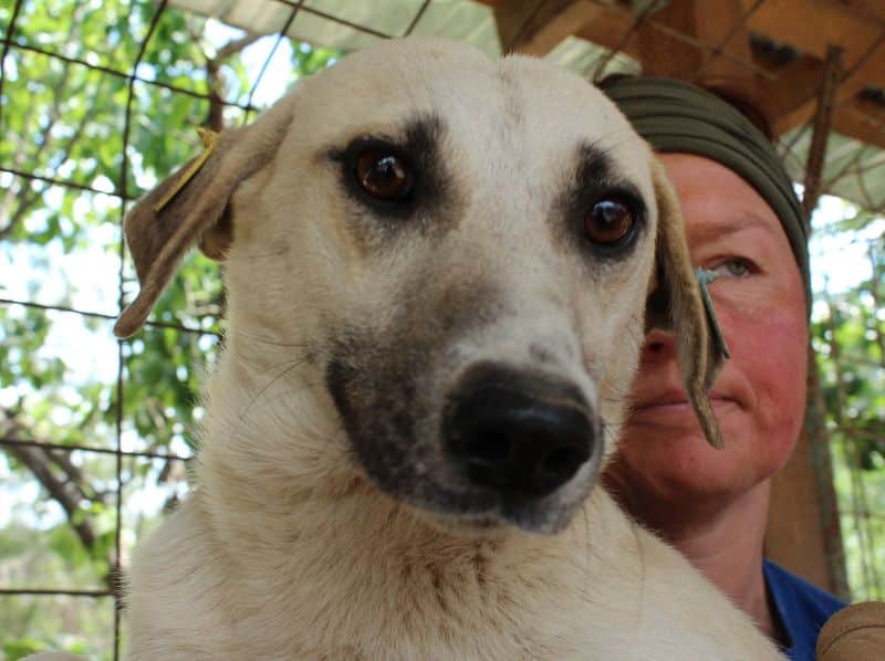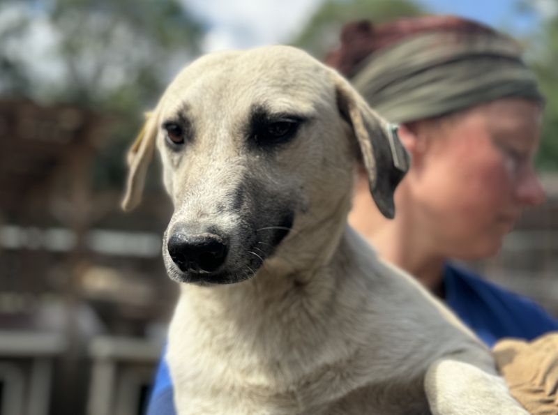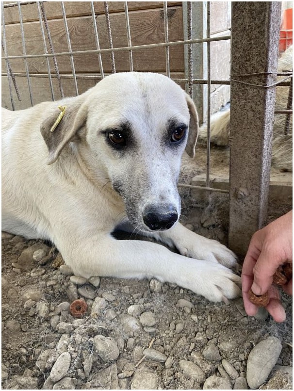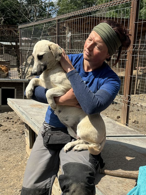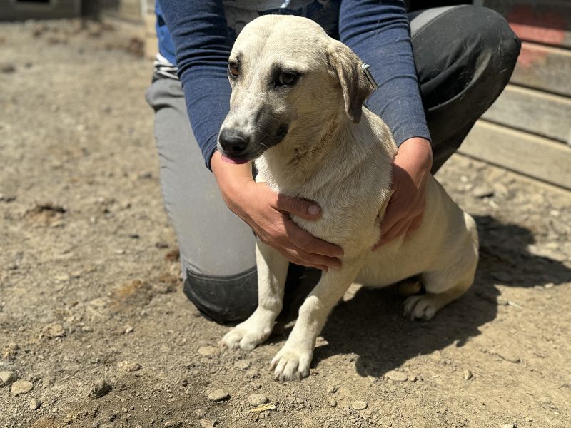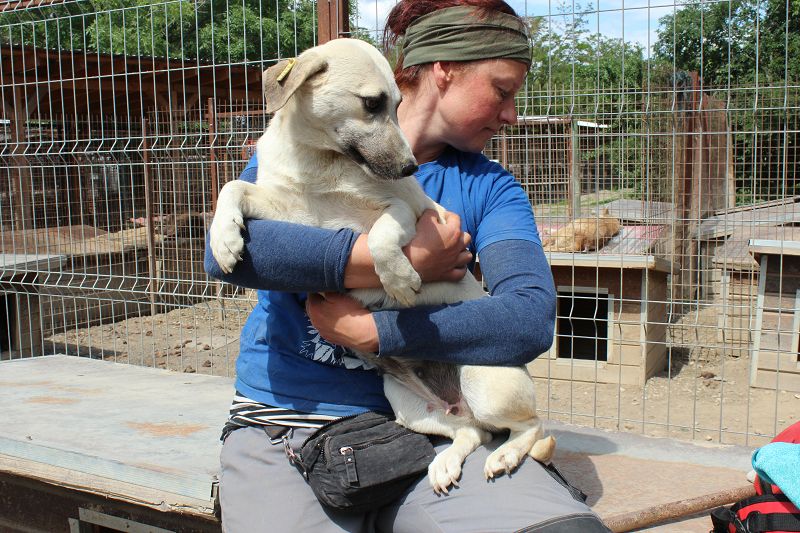 Die kleine, wunderschöne, helle Kurzhaarhündin BETTA war zunächst sehr skeptisch, als wir sie in ihrem Zwinger mit ihren Kumpels besuchten. Aus der Entfernung beobachtete sie uns ruhig und neugierig, während die anderen unsere leckeren Fleischbällchen aßen. Bei Annäherung lief sie zunächst weg. Umso erstaunlicher war es, dass sie ihre Skepsis ziemlich schnell durch ein zutrauliches Ansprechen und sanfte Berührungen ablegte und sich dann problemlos auf den Arm nehmen ließ. Sie wurde zunehmend weicher, entspannte sich und genoss die Streicheleinheiten, indem sie sich tiefer in den Arm legte. Hierbei wird deutlich, wie sehr diese süße Hündin vertrauen will und doch schnell bereit ist ihre sanfte Seele zu zeigen, die im stressigen Tierheimalltag jedoch nicht zum Ausdruck kommen kann. Die hübsche BETTA mit Kajal-Augen ist nun auf der Suche nach Menschen, die sie in ihrer sanften Art verstehen, ihr Zeit geben und ihr zeigen, wie schön das Leben sein kann.