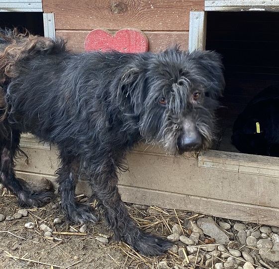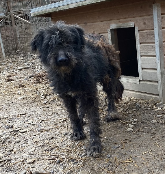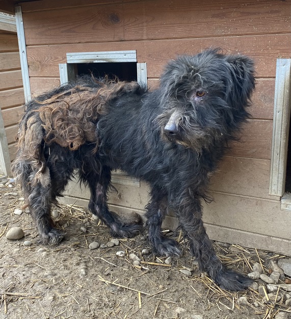 BILLA war zu Beginn der Erfassung in einer Hütte und hielt sich lieber im Hintergrund. Sie ist zurückhaltend, aber nicht panisch. Mit der Zeit taute sie etwas auf und zeigte sich interessierter. Leider ist das Fell stark verfilzt. Streicheln war nicht möglich und auch Futter nahm sie nur vom Boden.