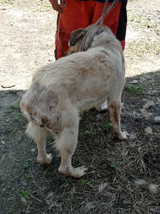 BILLI steht die Verzweiflung ins Gesicht geschrieben. Er leidet wirklich sehr unter der völligen Isolation und dann sitzt er jetzt noch in einem winzigen Kennel mit anderen Hunden. Er kam nur zaghaft aus seiner Hütte, als wir am Gitter standen, freute sich dann aber über Streicheleinheiten. Dennoch wirkt er sehr verzweifelt. Wir haben das Gefühl, dass er so langsam aufgibt.