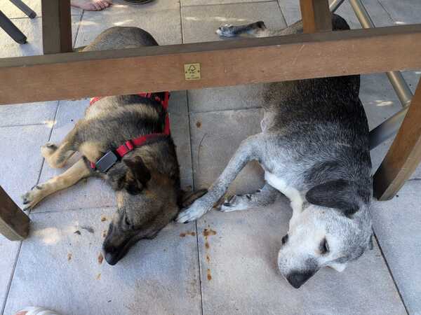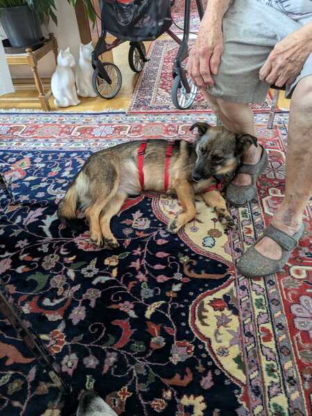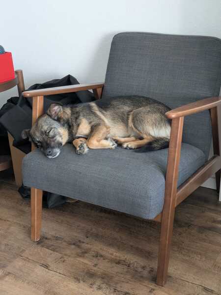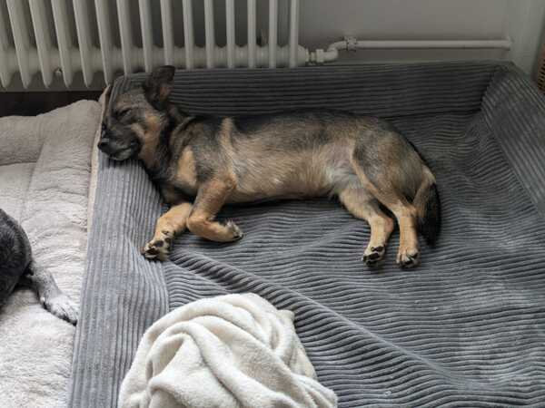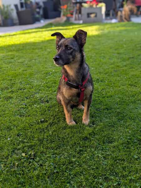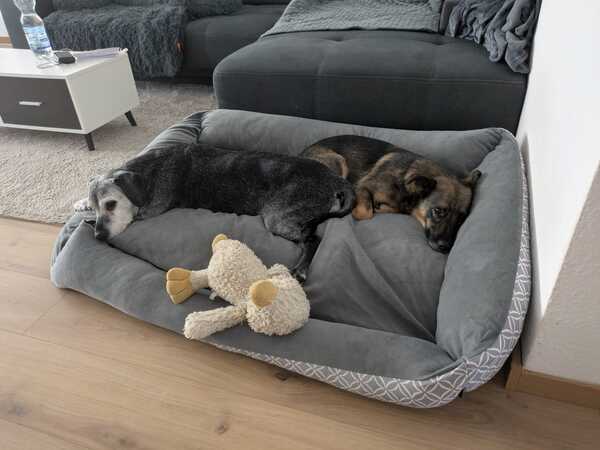 Beim Gassigehen orientiert sie sich gerne an ihrer Hundeschwester, läuft gut an der Leine und erkundet auch schon schnüffelnd die Welt. Manchmal sind ihr neue Reize oder große Hunde draußen noch etwas unheimlich, aber mit Ruhe und Geduld taut sie schnell auf und merkt, dass es gar nicht so schlimm ist. Autofahren üben wir noch – aktuell ist das für sie noch etwas stressig und bei längeren Fahrten wird ihr übel.