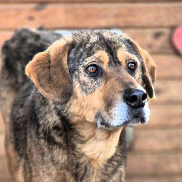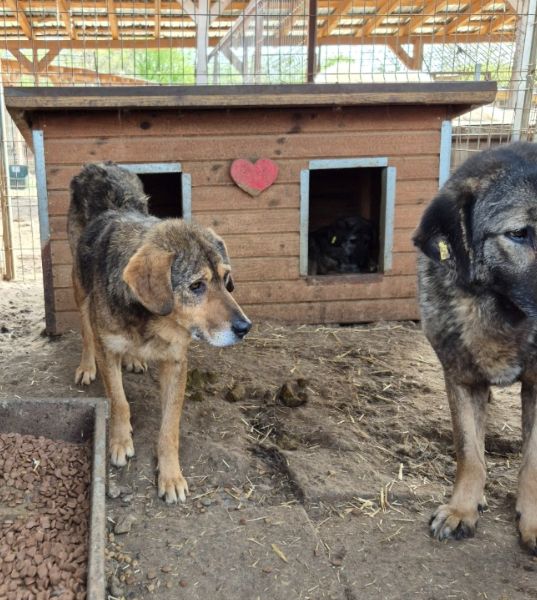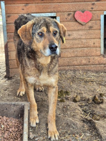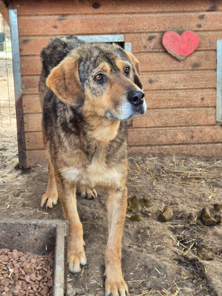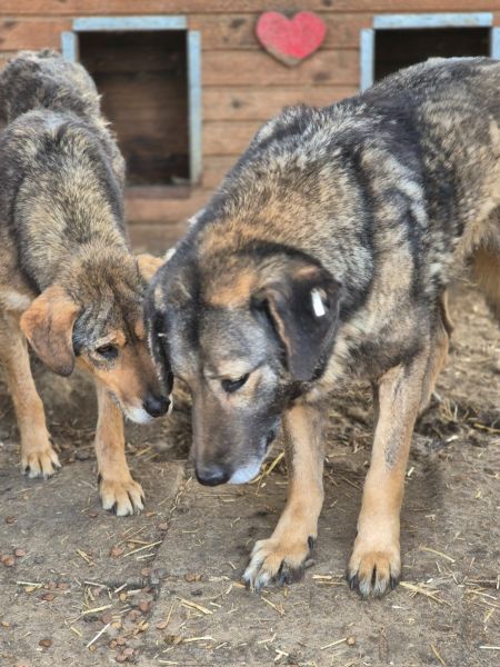 Die zart gebaute BIRGITTA hat eine schöne Wandlung durchgemacht. Zunächst lag sie nur desinteressiert auf dem Hüttendach; als wir uns jedoch im Kennel aufhielten und die anderen Hunde Leckerchen erhielten, war sie plötzlich auch aktiv dabei. Sie kam von ihrer erhöhten Position zu uns und nach anfänglichem Zögern nahm sie sogar die angebotenen Leckerchen aus der Hand. Da kann man drauf aufbauen, mit mehr Zeit und einer ruhiger Umgebung dürfte sie weiter aus ihrer Unsicherheit herausfinden. Eine hübsche Hündin mit einer schönen Zeichnung und ausdrucksvollen Augen.