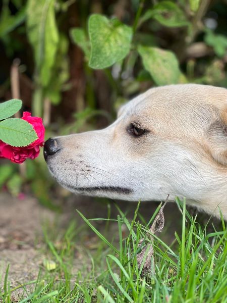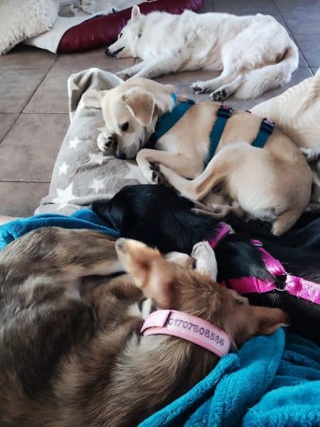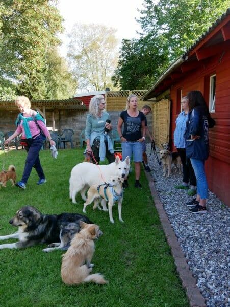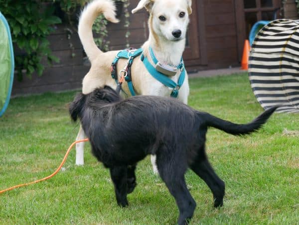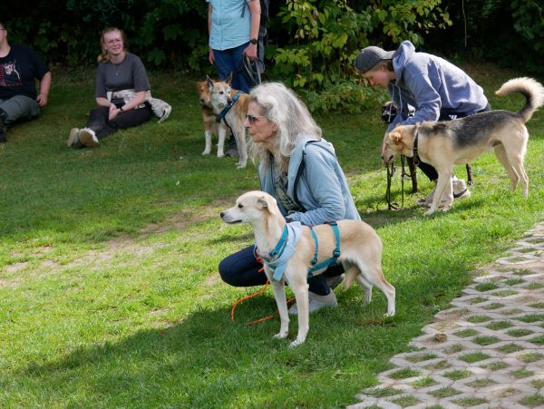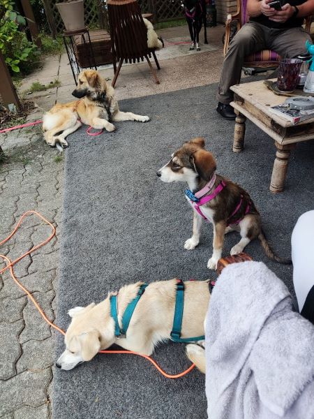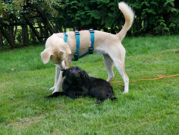 Begegnungen mit fremden Besuchern sind erst mal zögerlich, sie braucht Zeit, die Situation als gefahrlos einschätzen zu können. Hier ist aktuell noch die Leine / Hausleine eine wertvolle Hilfe. Sie gibt Blanka Sicherheit, die Verbindung zu ihren Menschen kann jederzeit punktgenau aufgenommen, geholfen werden. Auch das wird sich weiter einspielen und irgendwann nicht mehr notwendig sein. Begegnungen mit Besucherhunden verlaufen je nach Gegenüber in der Regel freundlich und interessiert oder desinteressiert, jedoch niemals pöbelig. Nach ganz kurzer Zeit wird dann hier gerne Freundschaft geschlossen, und hund tobt gerne gemeinsam durch den Garten, durch die Hecken.