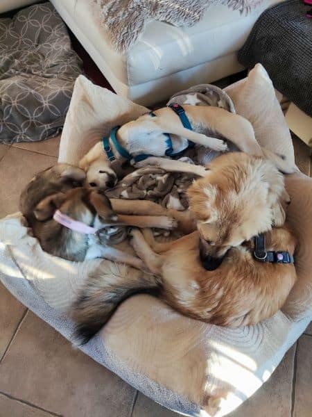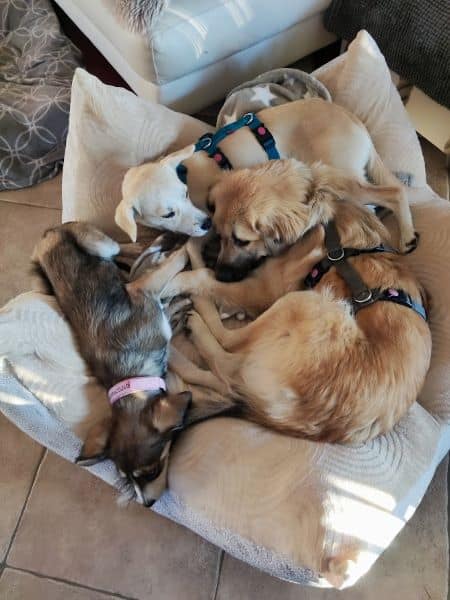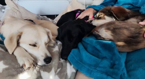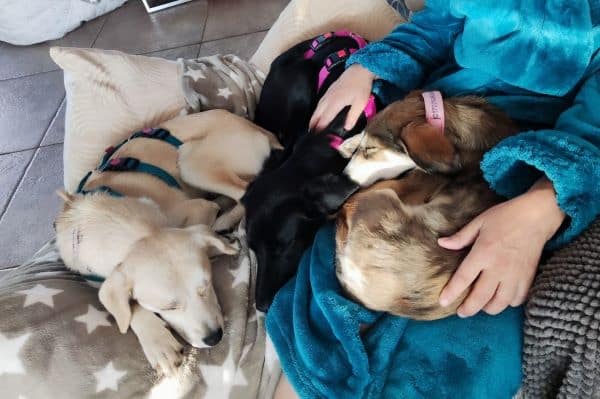 Mindestens genauso gerne liegt sie allerdings auch eng an ihr Pflegefrauchen gekuschelt auf der Krone und startet gemütlich in den Tag. Oder lässt sich am Abend eben dort auch vom Fernseher berieseln. Gerne dürfen auch ein, zwei weitere Hunde mit dabei sein; solange sie noch ein Eckchen Kissen und ein Zipfelchen Kontakt hat. Und das Pflegefrauchen auch weiterkrault.