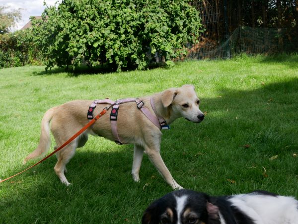 Blanka ist stubenrein, ist katzenverträglich, nicht futterneidisch, man kann ihr gefahrlos Dinge wieder abnehmen, sie schläft nachts durch, sie ist keine Kläfferin, ein tiptop Bürohund, fährt gut und gerne im Auto mit und liebt es Spazieren zu gehen. Sie läuft prima an der kurzen Leine und wo es möglich ist auch an der langen Schlepp. Die Welt ist aufregend, die Welt ist neu und groß und bunt. Autos, Fahrräder, Mülleimer, Menschen, Hunde sind ohne Probleme passierbar. Dieser kleine inzwischen recht muskulöse Körper liebt es, sich rasch fortzubewegen. Ich könnte mir gut vorstellen, dass sie ein toller Joggingpartner werden kann. Oder auch Spaß an Agility oder anderem Hundesport hat.