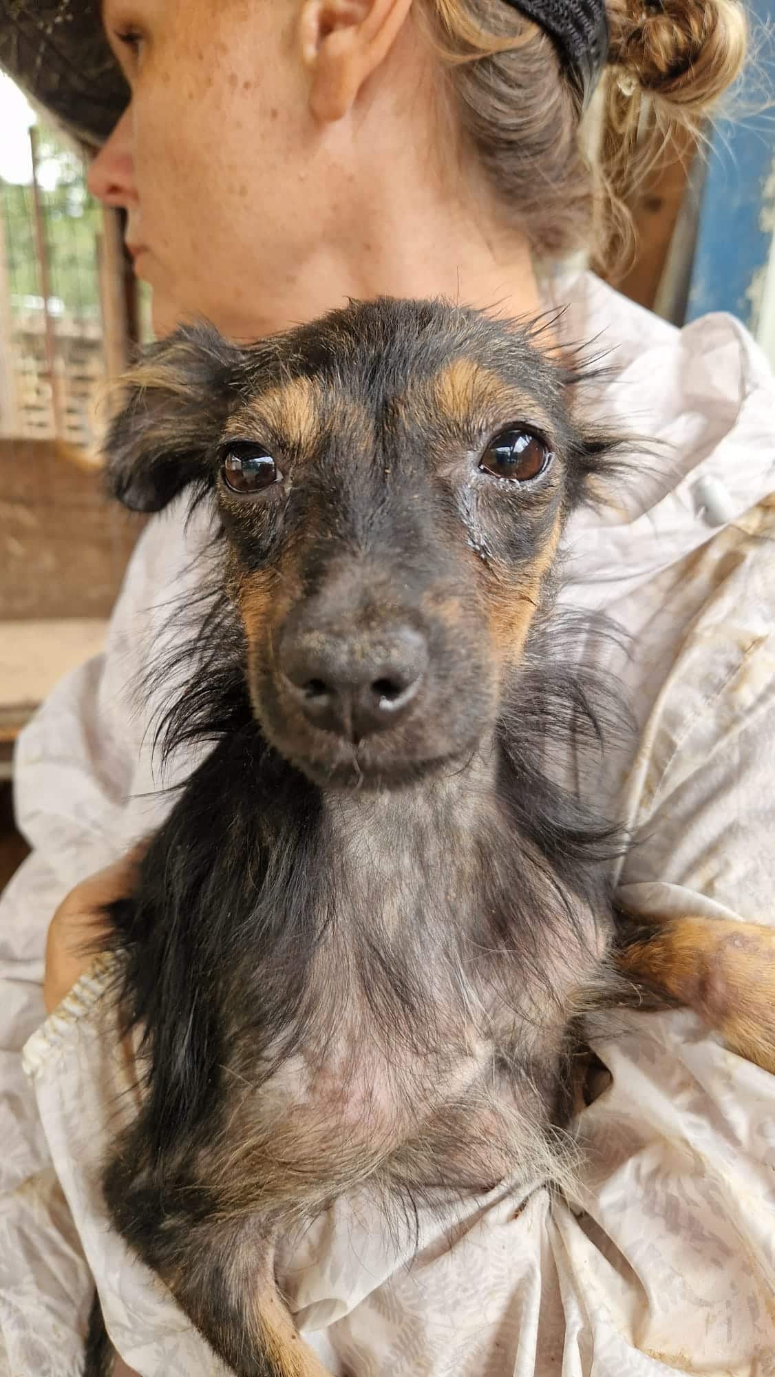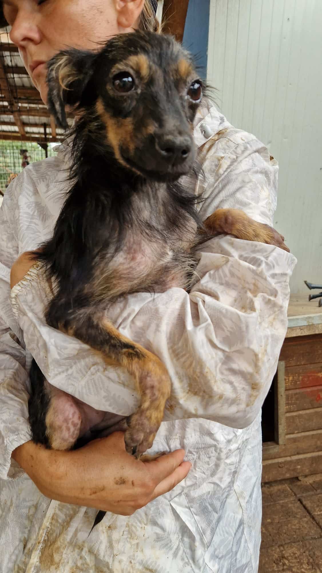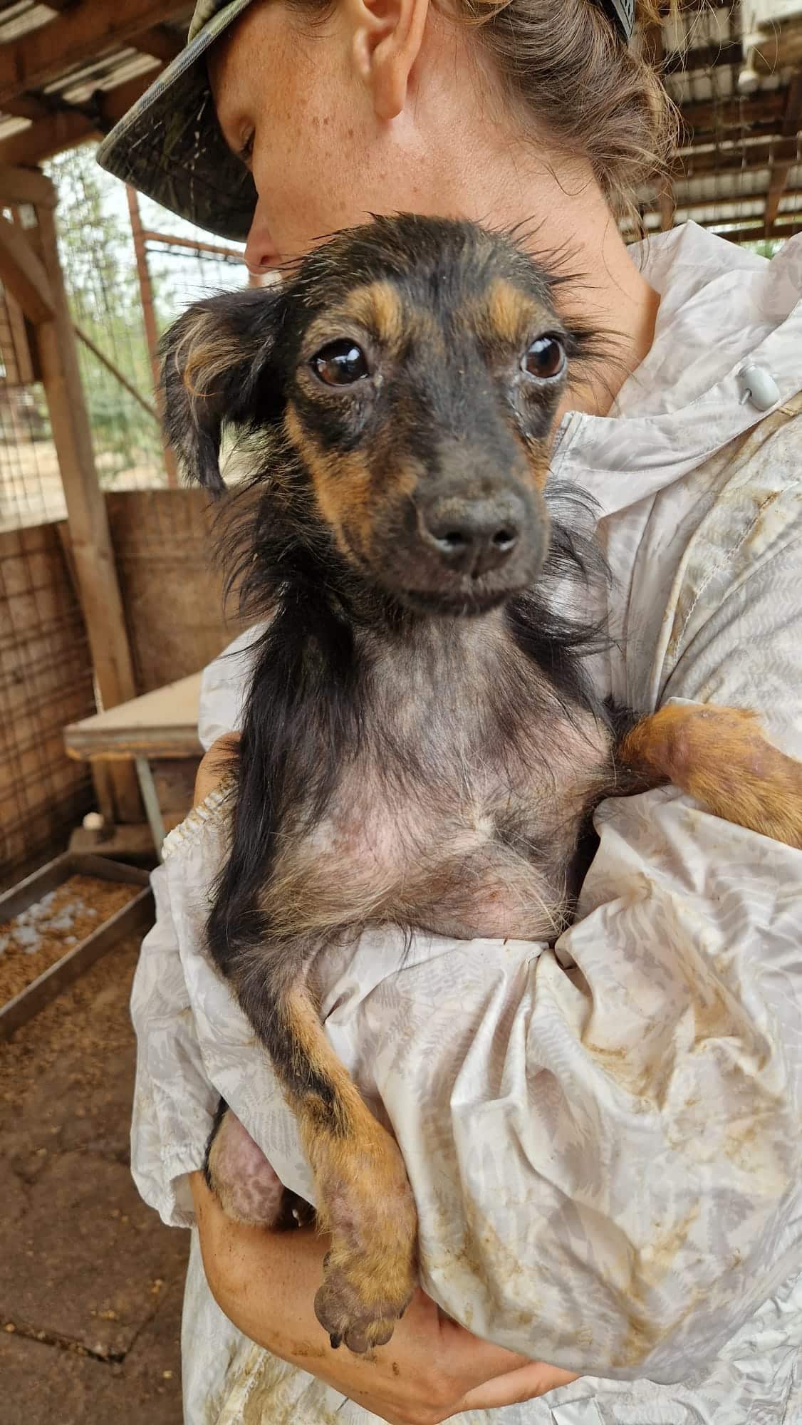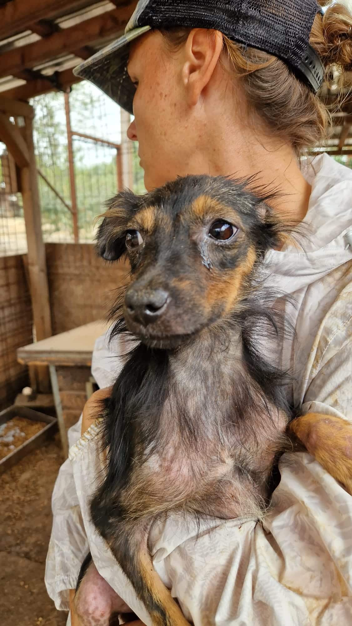 Die kleine BLISSY saß während unserer Anwesenheit nur in der Hütte, ließ sich aber problemlos rausholen, zeigte sich sehr lieb und ohne Abwehrverhalten. Sie verhielt sich insgesamt etwas schüchtern, ist aber auch körperlich und seelisch in keinem guten Zustand. Wir denken schon, dass sie in einer stressfreien Umgebung schnell auftauen wird. BLISSY zeigte sich auch gut verträglich mit den anderen 17 Hunden in ihrem Kennel.