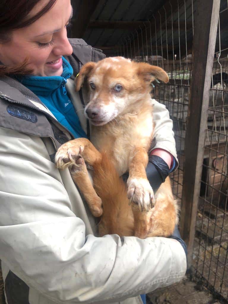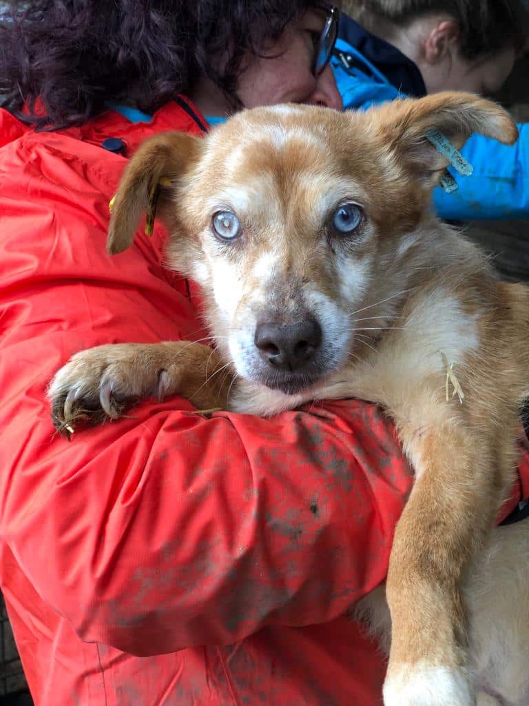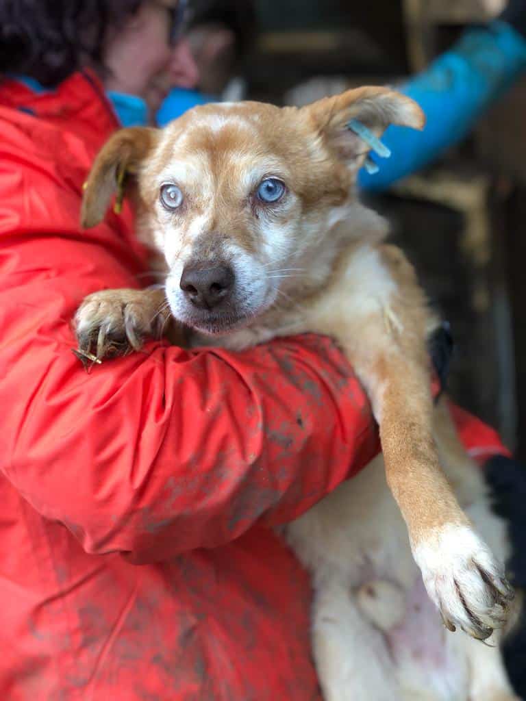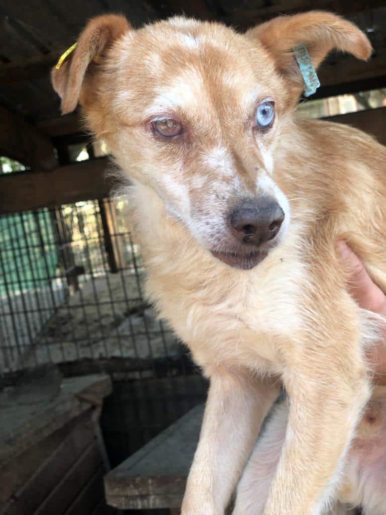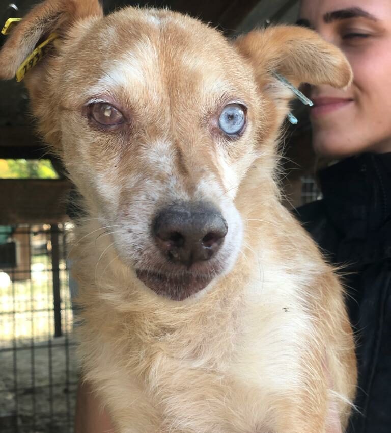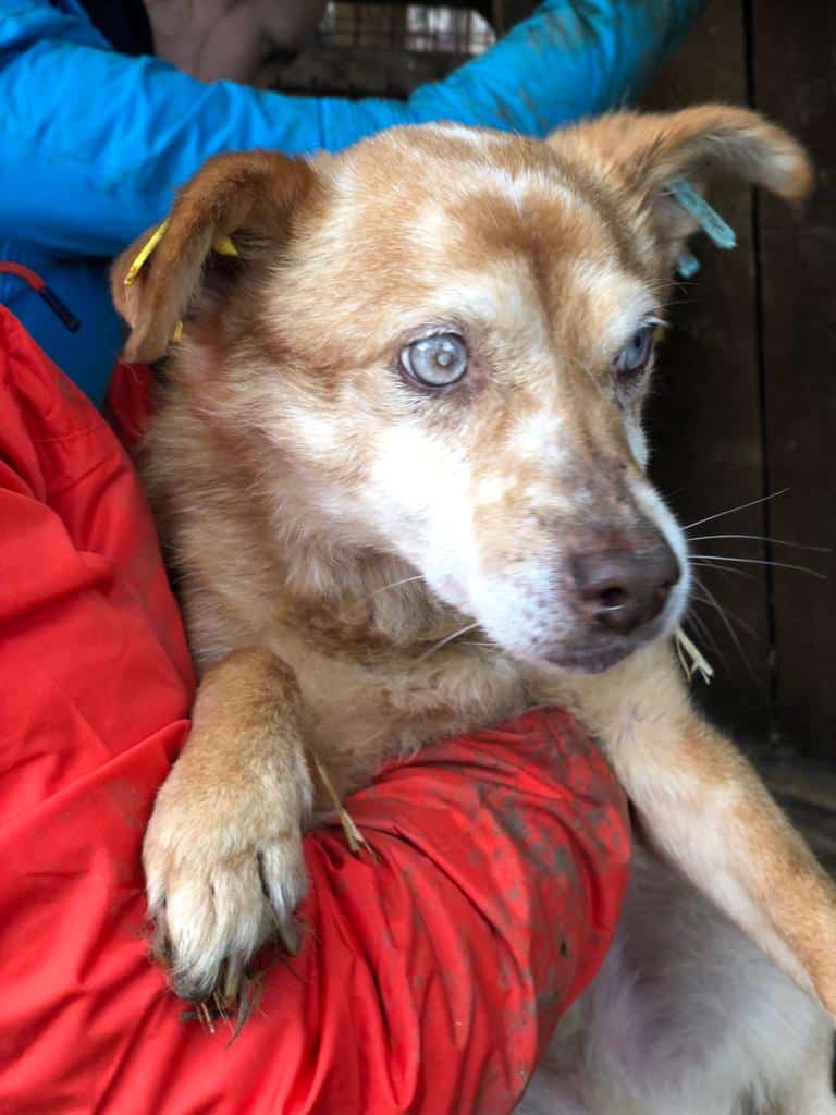 BLUE ist sehr alt – mindestens 12 Jahre alt, ggf. auch 14. Er liegt seit Monaten in überfüllten, winzigen, dreckigen Welpenkenneln, weil kein anderer Platz für ihn sicher ist.