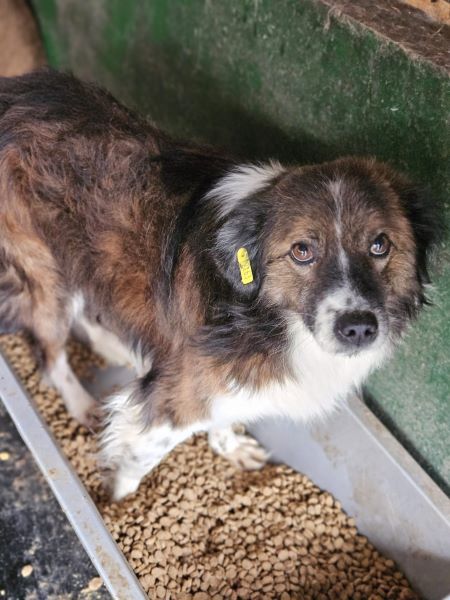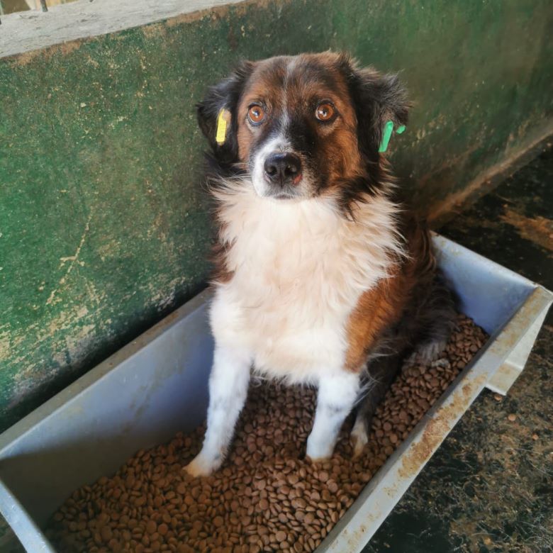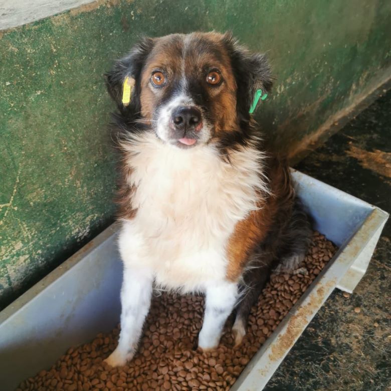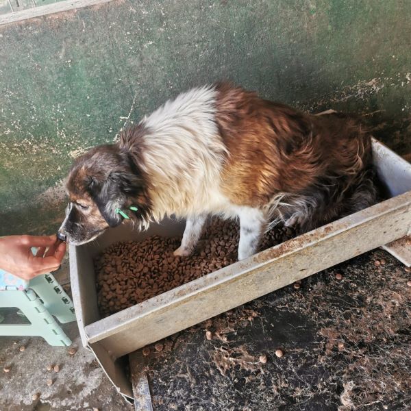 Als wir den Kennel betraten hatte es sich dieser nette Rüde im Futtertrog gemütlich gemacht. Zunächst war er etwas skeptisch, nahm aber dann gerne unsere Leckerchen an. Wir konnten ihn vorsichtig anfassen, was er jedoch noch nicht genießen konnte. Trotzdem haben gemerkt, dass er sich immer mehr entspannen konnte. Als er aufstand haben wir gemerkt, dass er eine Verletzung am Bein hatte und dieses nicht belasten konnte.