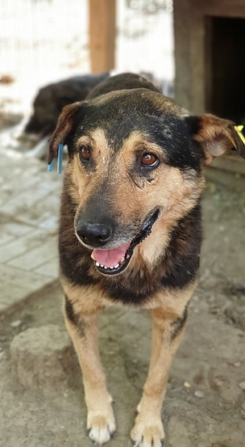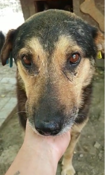 BOBBY ist ein ganz sanfter und ruhiger Rüde, der sich sofort problemlos überall streicheln ließ. Ganz zärtlich schmiegte er sich an uns und hat uns mit seiner liebevollen Art sehr berührt. Wir haben eine offene Stelle an seinem Hodensack gefunden und Tierärztin Catalina geholt. Sie hat ihn untersucht und mitgeteilt, dass es eine alte Verletzung und kein Tumor ist, was wir zuerst vermutet hatten. BOBBY hat die Untersuchung ganz lieb über sich ergehen lassen. Er ist schon alt und völlig fertig. Die Hoffnung, noch einmal aus seinem Kennel zu kommen, scheint er aufgegeben zu haben.