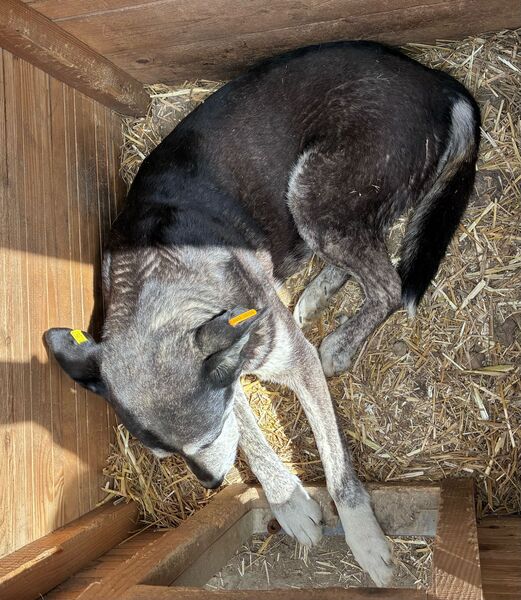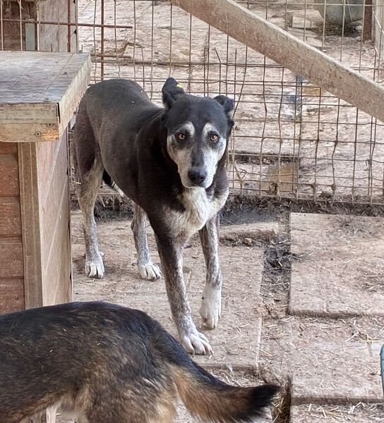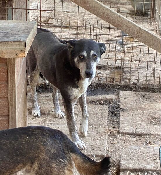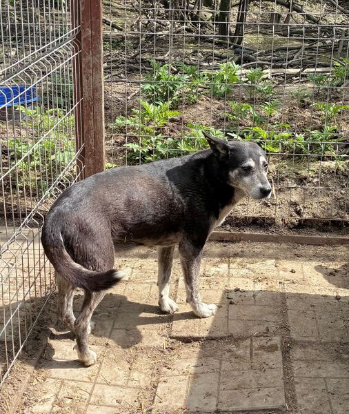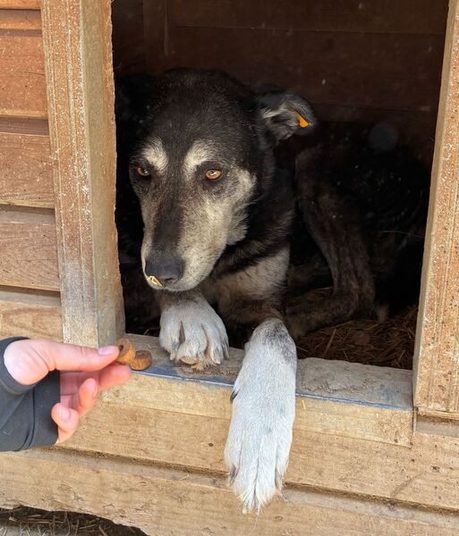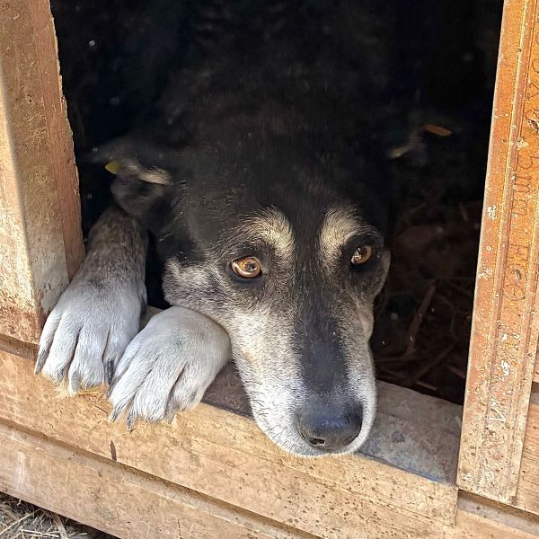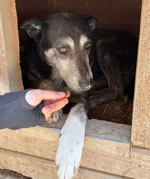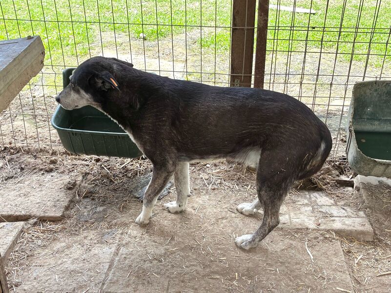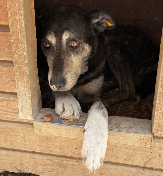 Diese etwas ältere Dame ließ sich von unserem Besuch nicht aus der Ruhe bringen und beobachtete das Geschehen aus der Hütte heraus. Als wir uns ihr zuwandten und Leckerlie anboten, blieb BONJA zunächst entspannt liegen, ohne sich für unser Futter zu interessieren. Beim Öffnen der Hütte überlegte sie es sich anders, schlenderte durch den kennel und legte sich schließlich wieder in eine Hütte. Uns fiel auf, dass BONJA ihr linkes Vorderbein schont, vermutlich hat sie dort eine alte Verletzung. Die Tierärztin wurde informiert. Wir bedrängten diese gemütliche Hündin nicht weiter und hoffen doch, dass sie schon bald von ihren Menschen gesehen wird, damit sie in Geborgenheit ankommen und heilen kann. Für BONJA suchen wir einen ruhigen und liebevollen Platz bei erfahrenen Menschen, die sie in ihrem Tempo auftauen lassen. Ein entspannter Ersthund würde ihr die Umstellung sicher erleichtern.