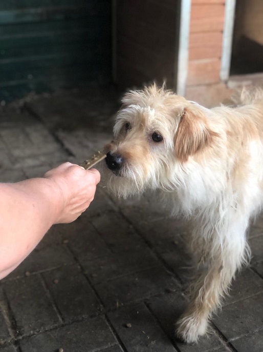 holt sich Leckerchen aus der Hand, wenn die anderen Hunde nicht im Weg sind