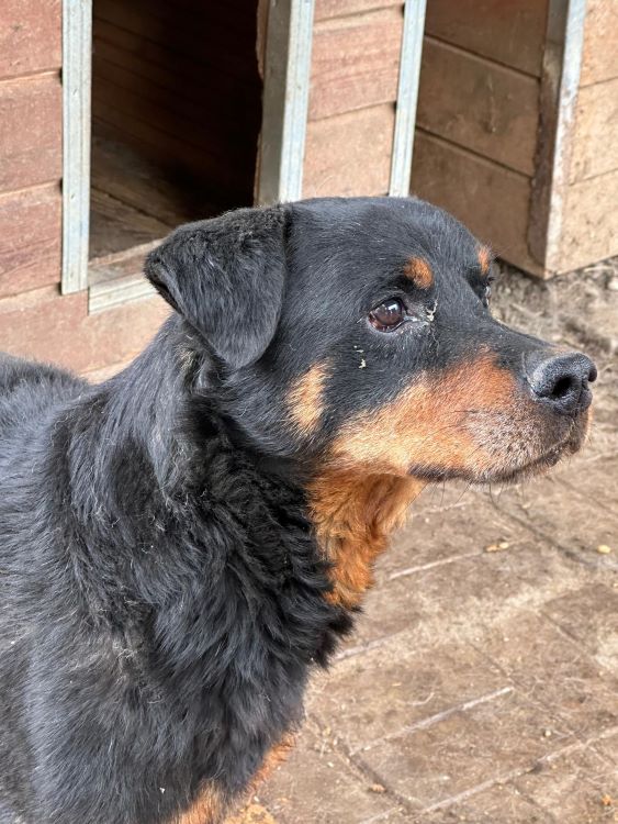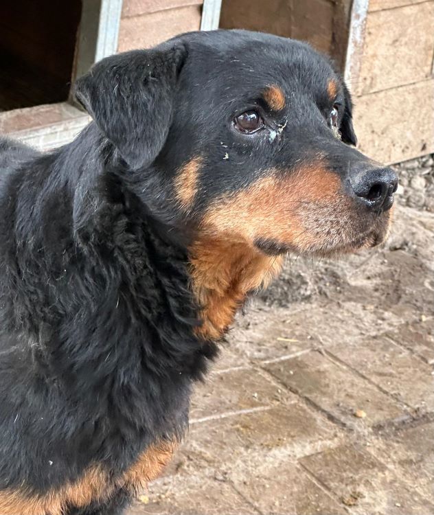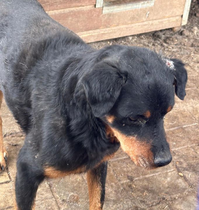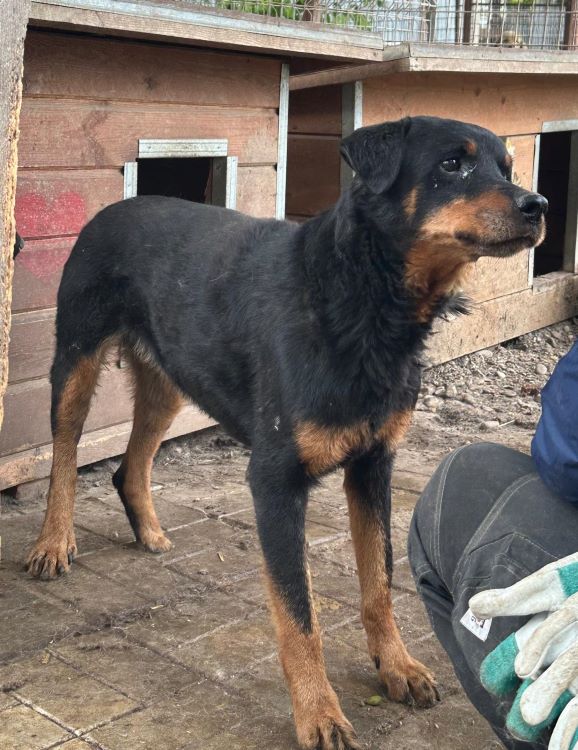 halbe Rute, linke Hinterpfote fehlt größtenteils, Rottweiler (ggf. Mix), seit mind. August 2019 im Tierheim