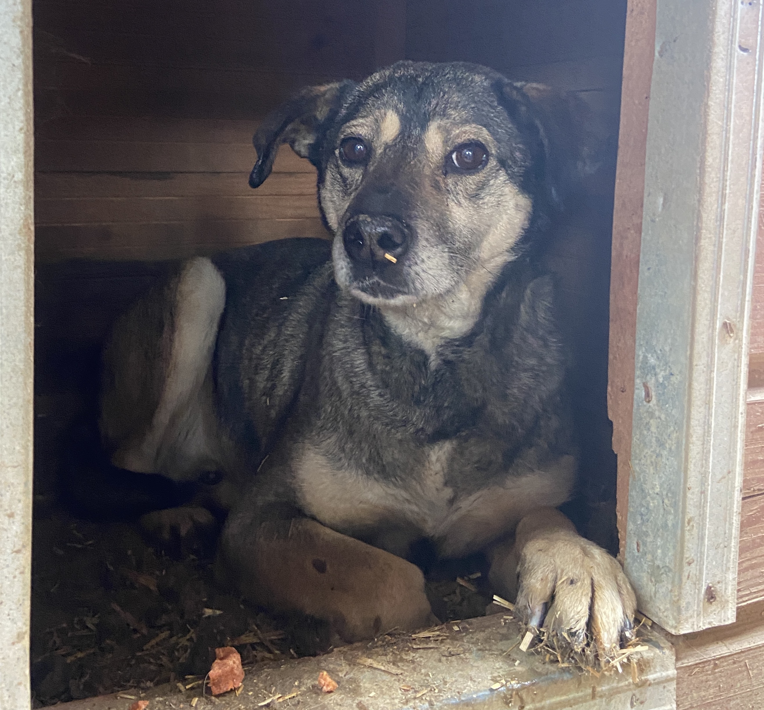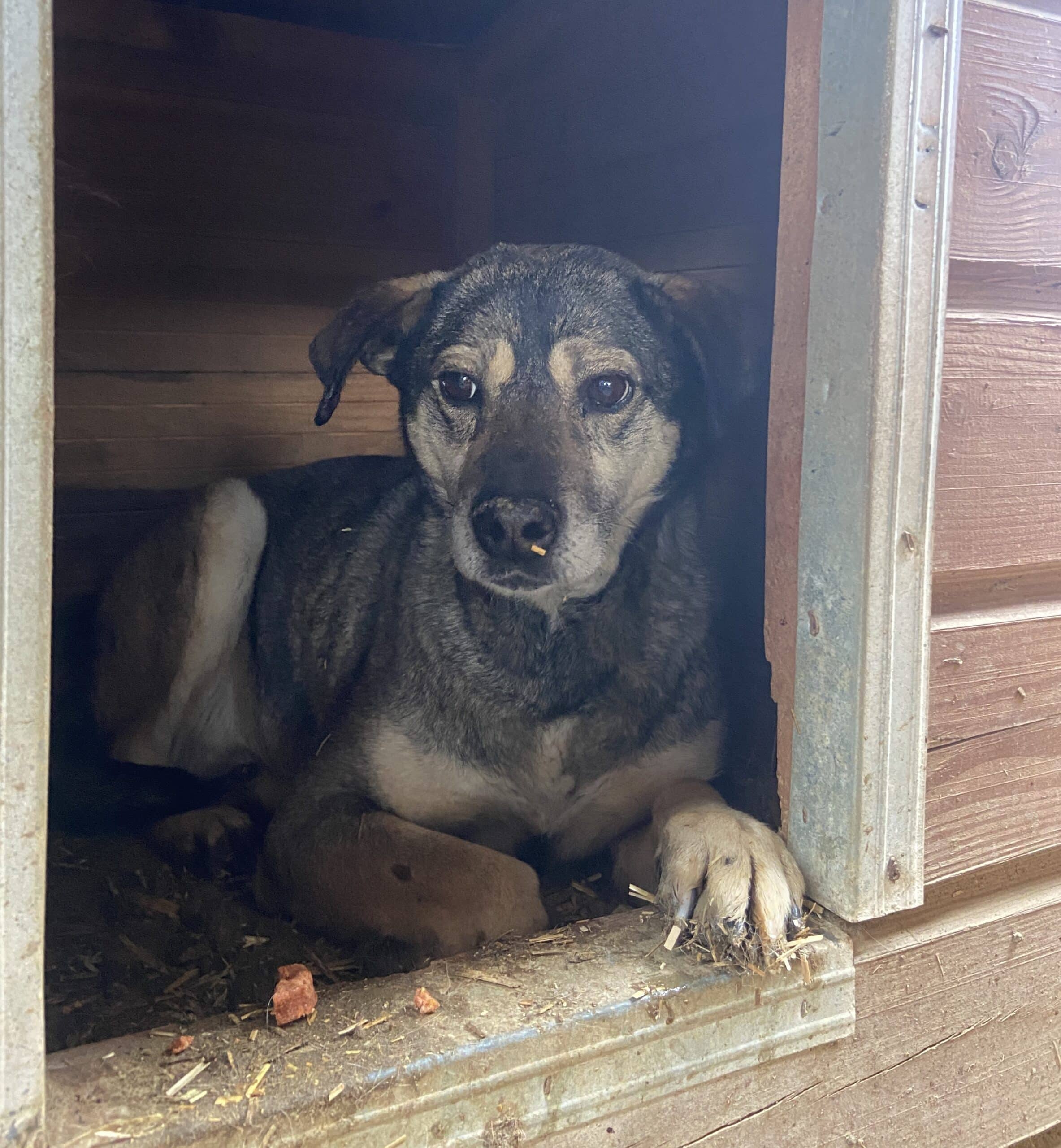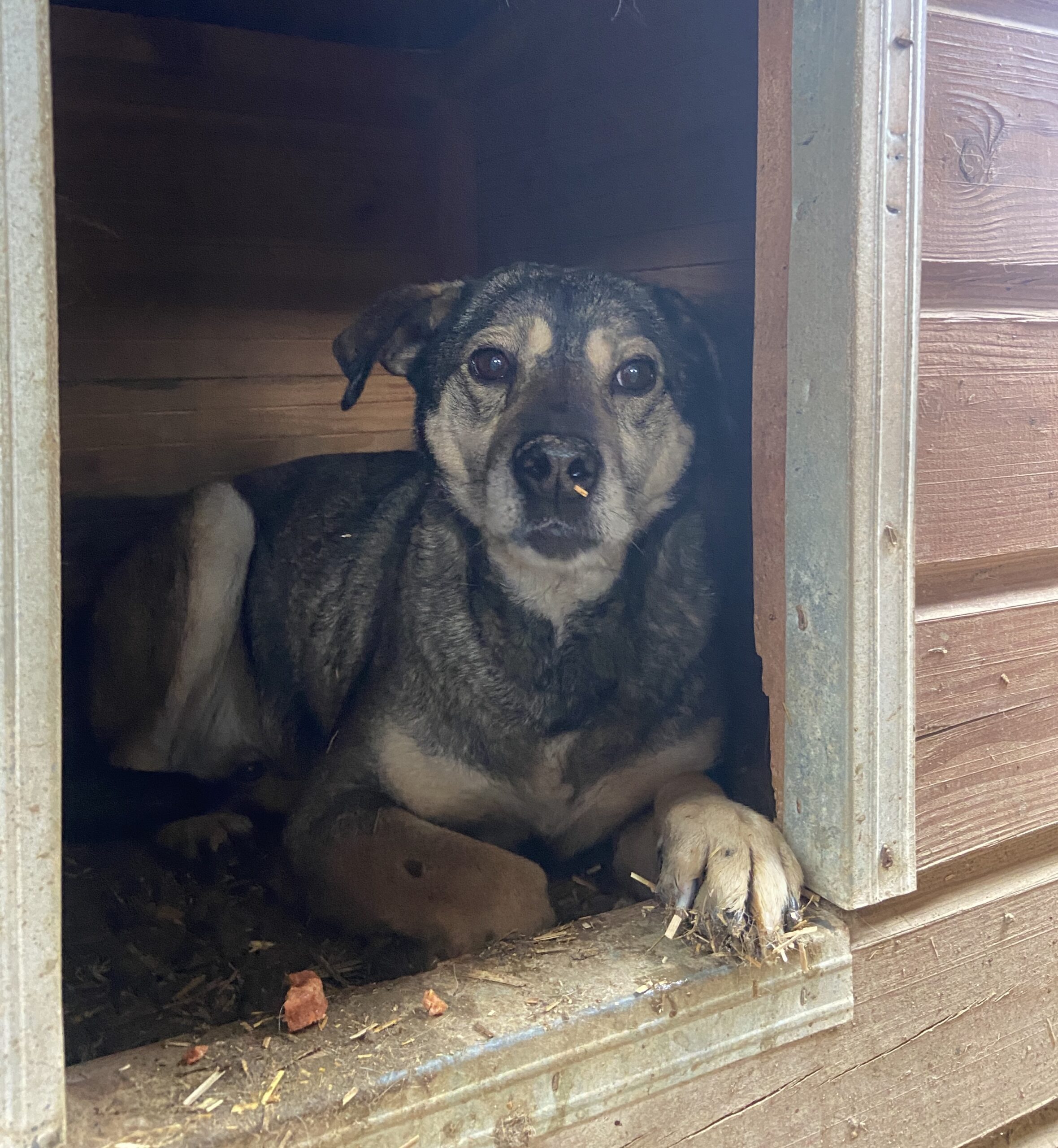Unser süßer BULLY ist alt geworden, er liegt nur noch in der Hütte und hat wenig Interesse an dem, was wir im Kennel treiben. Er nahm die Leckerlie in unserem Beisein, aber leider nicht mehr direkt aus der Hand. Außerdem schien es so, als ob er große Probleme beim Kauen der Leckerlies hatte. Wir wollten ihn nicht bedrängen, weshalb wir nicht versuchten ihn zu streicheln. BULLY lebt aktuell nur mit Hündinnen zusammen, mit denen zeigt er sich verträglich. Wir würden uns sehr wünschen, dass BULLY Menschen mit viel Erfahrung und wenig Erwartungenan ihn finden kann, die ihm endlich das schöne Leben zeigen und ihm ein weiches Bettchen schenken.