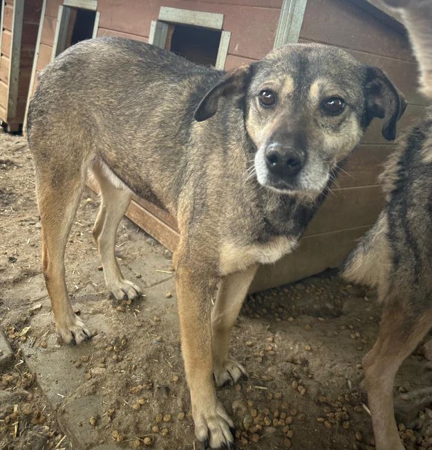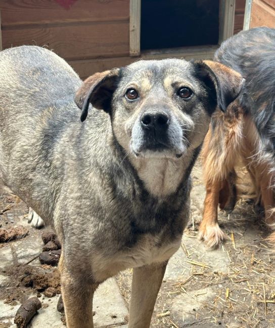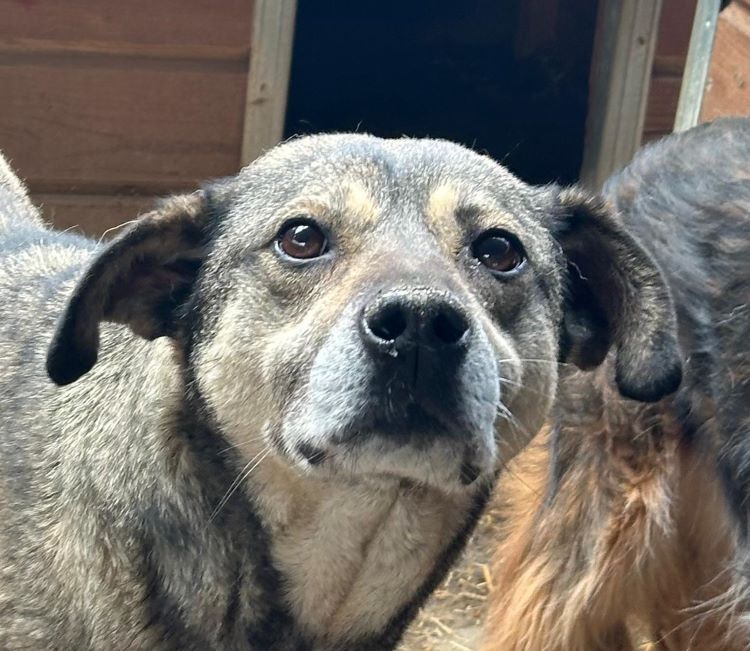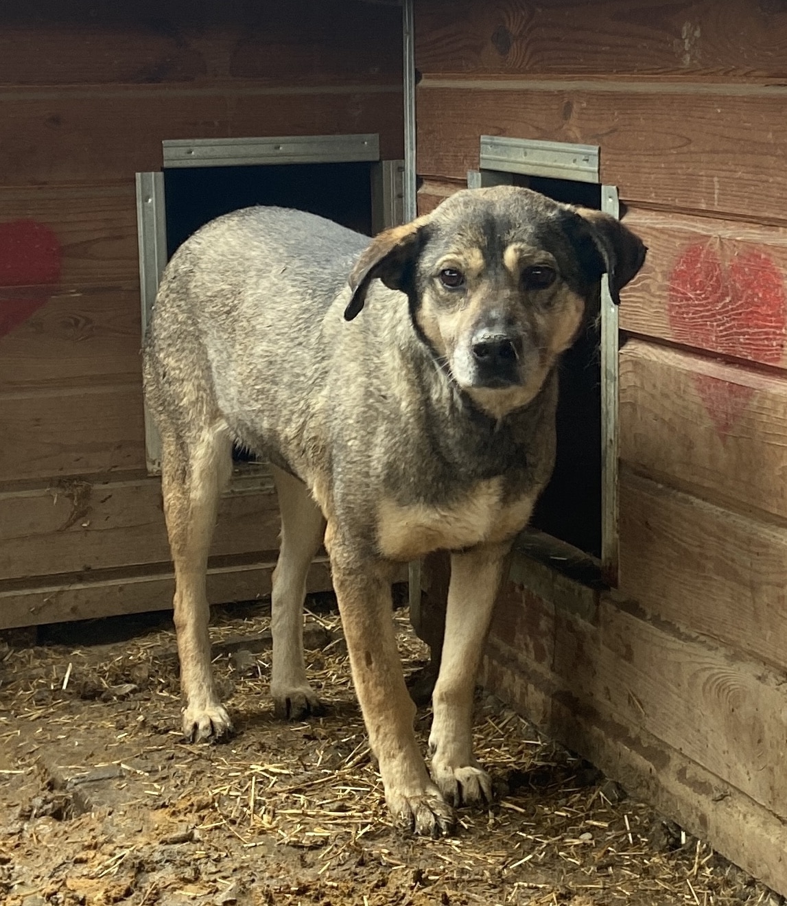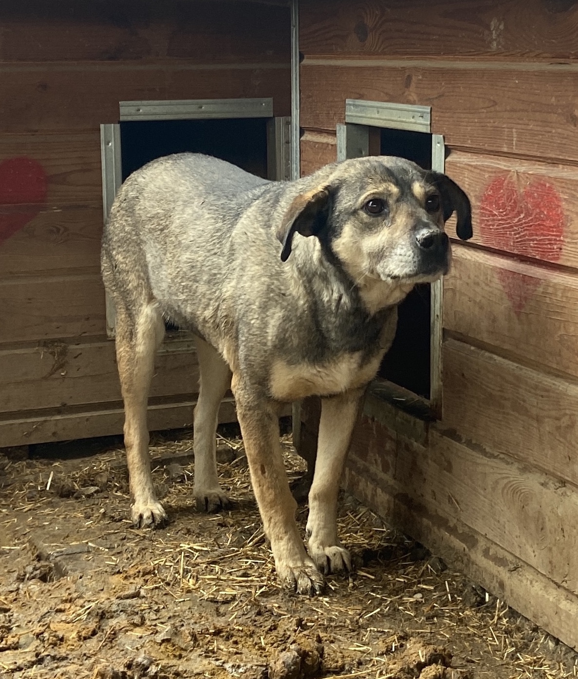 Unser süßer BULLY ist alt geworden, er liegt nur noch in der Hütte und hat wenig Interesse an dem, was wir im Kennel treiben. Er nahm die Leckerlie in unserem Beisein, aber leider nicht mehr direkt aus der Hand. Außerdem schien es so, als ob er große Probleme beim Kauen der Leckerlies hatte. Wir wollten ihn nicht bedrängen, weshalb wir nicht versuchten ihn zu streicheln. BULLY lebt aktuell nur mit Hündinnen zusammen, mit denen zeigt er sich verträglich. Wir würden uns sehr wünschen, dass BULLY Menschen mit viel Erfahrung und wenig Erwartungenan ihn finden kann, die ihm endlich das schöne Leben zeigen und ihm ein weiches Bettchen schenken.