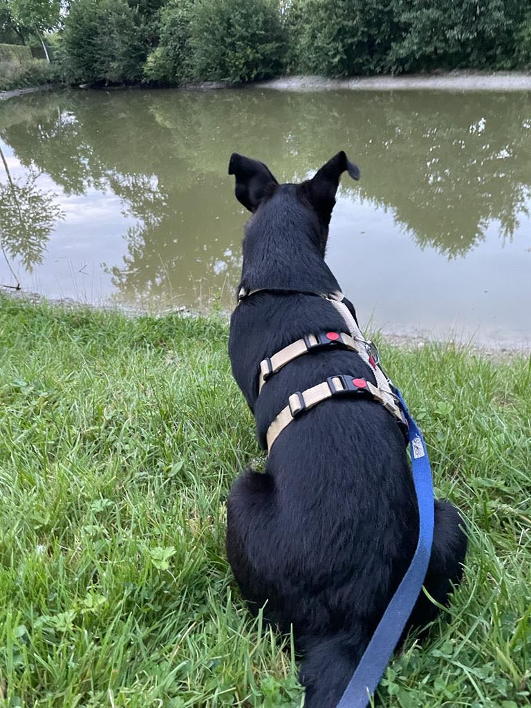 Die täglichen Gassirunden genießt er sehr, ist hier und da noch etwas unsicher wegen der vielen neuen Eindrücke und fremden Geräusche und Gerüche. Er geht problemlos an der Leine. Fahrradfahrer und Jogger sind ihm egal, sogar Katzen ließen ihn kalt. Bei anderen Hunden reagiert er neugierig, aber zurückhaltend.