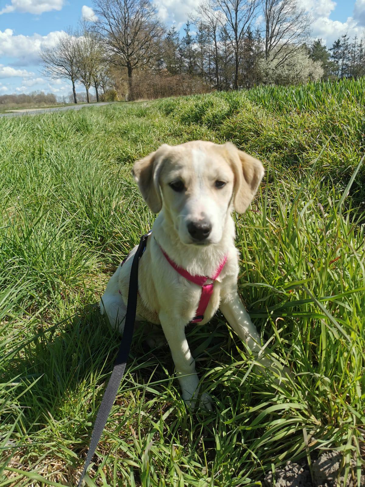 Cailla geht offen und freundlich auf Menschen zu. Die junge Hündin muss wie jeder andere junge Hund noch viel lernen. An der Stubenreinheit wird bereits auf der Pflegestelle mit ihr gearbeitet.