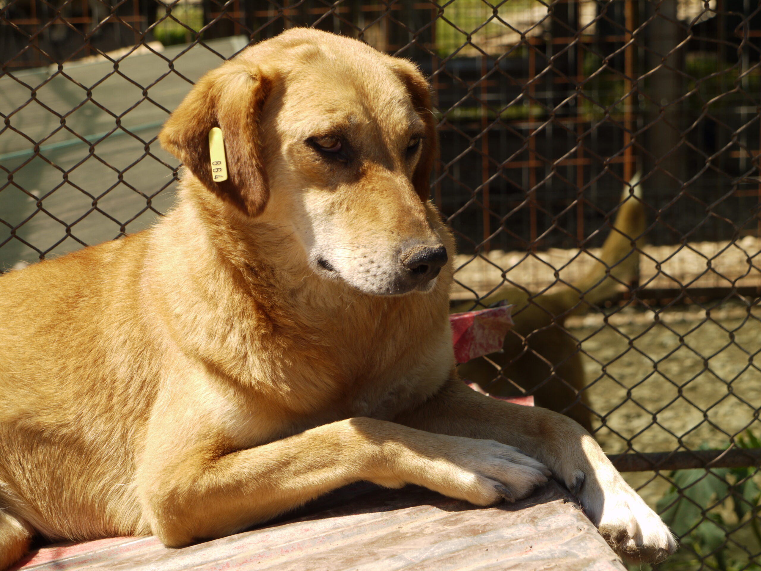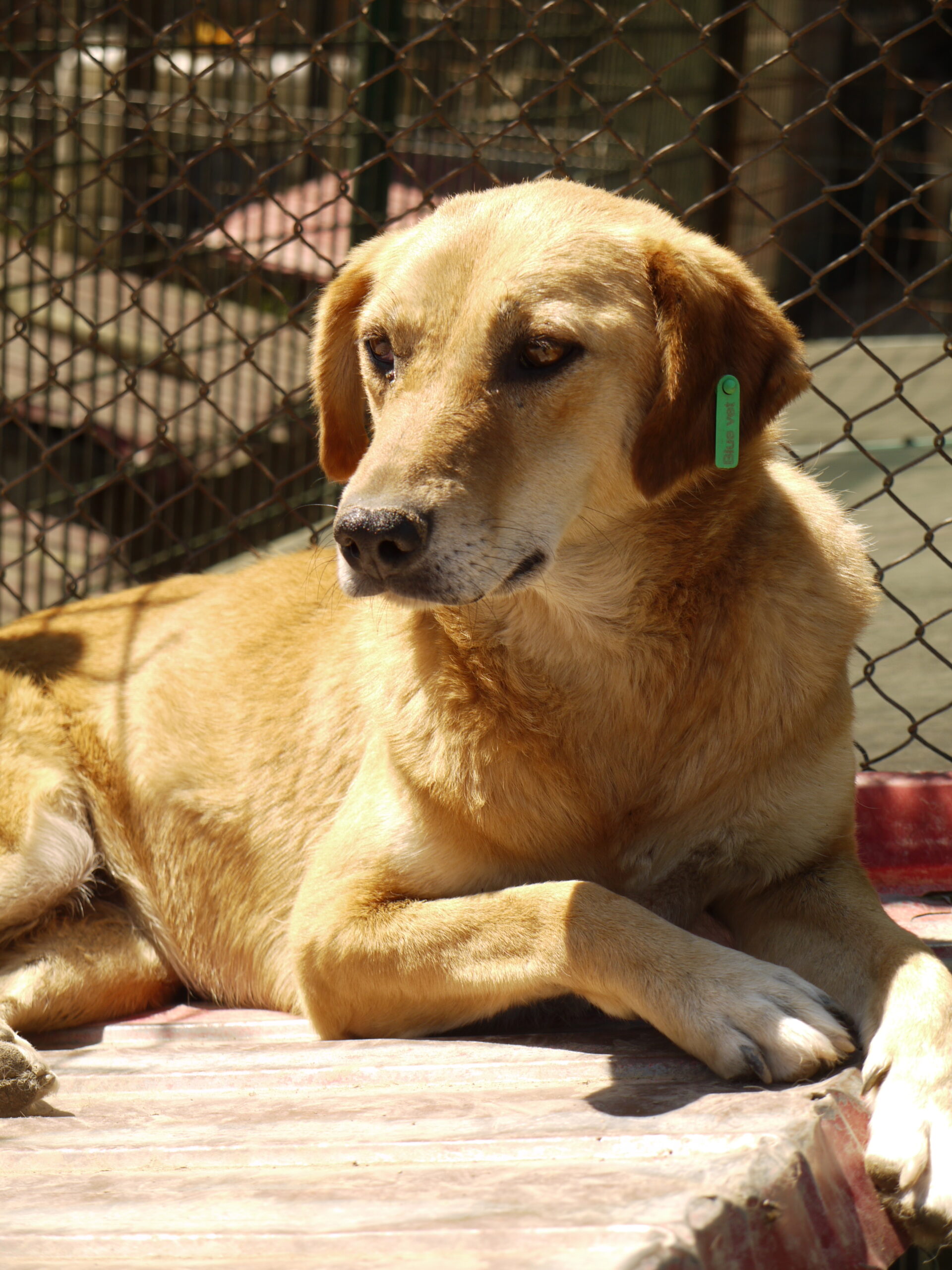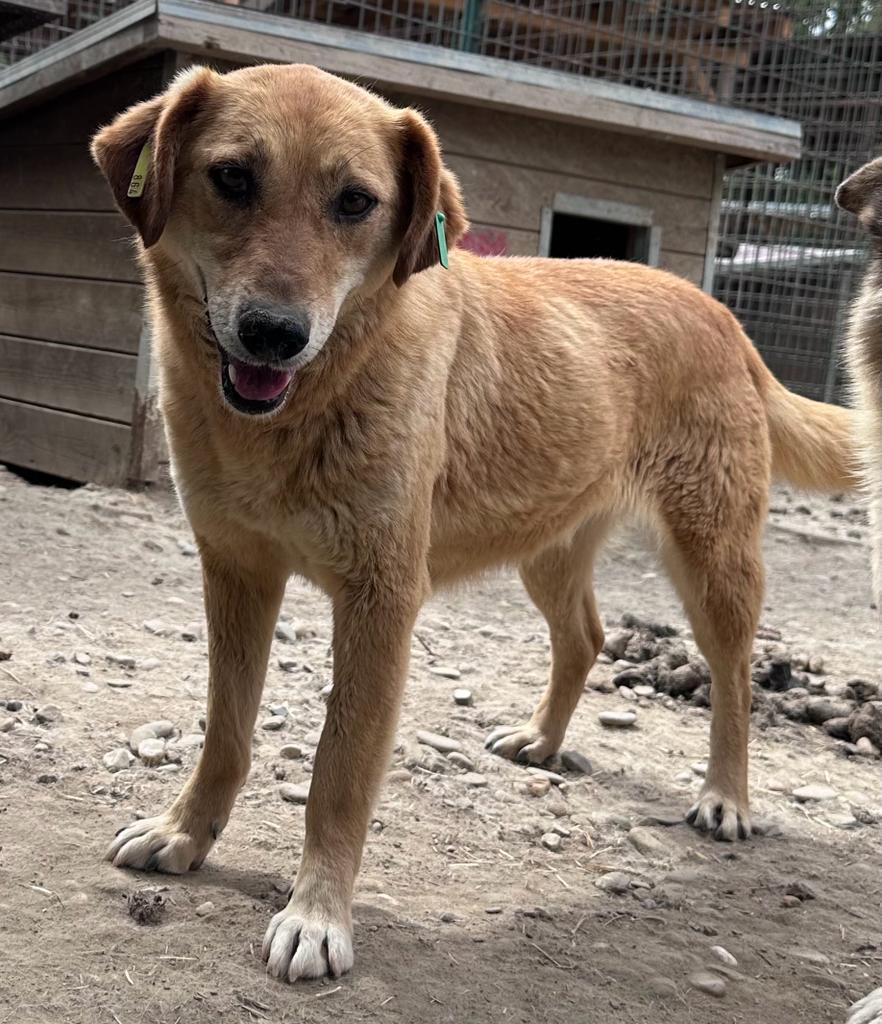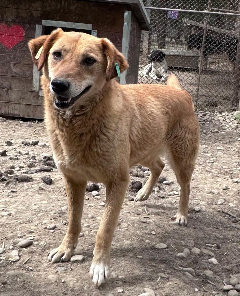 CALYPSO beobachtete uns neugierig vom Hüttendach. Als wir uns ihr zuwandten, nahm sie gerne unsere Leckerchen, wenn wir sie ihr hinlegten. Für mehr fehlte ihr der Mut und sie wich zurück. Wir hoffen sehr, dass sie nach fast 7 Jahren im Shelter nun endlich eine Ausreisemöglichkeit erhält.