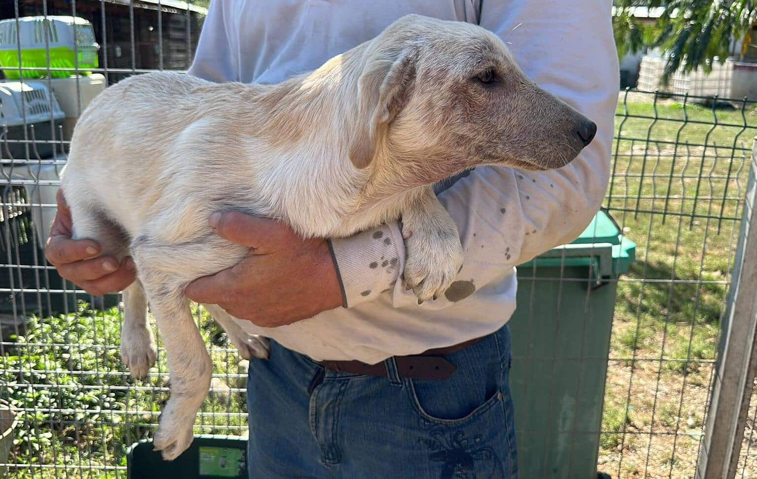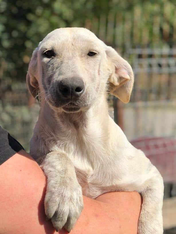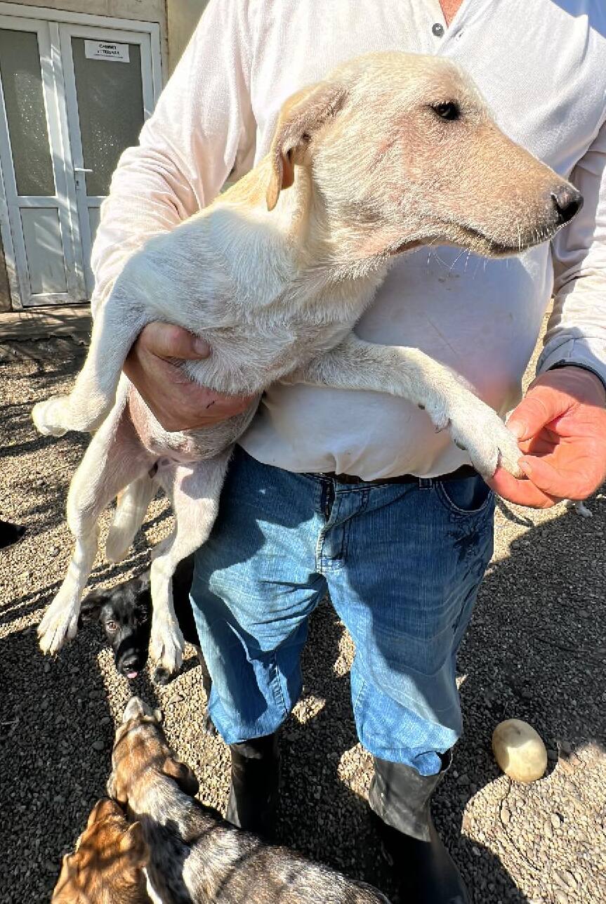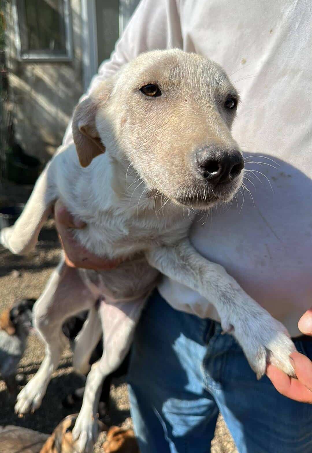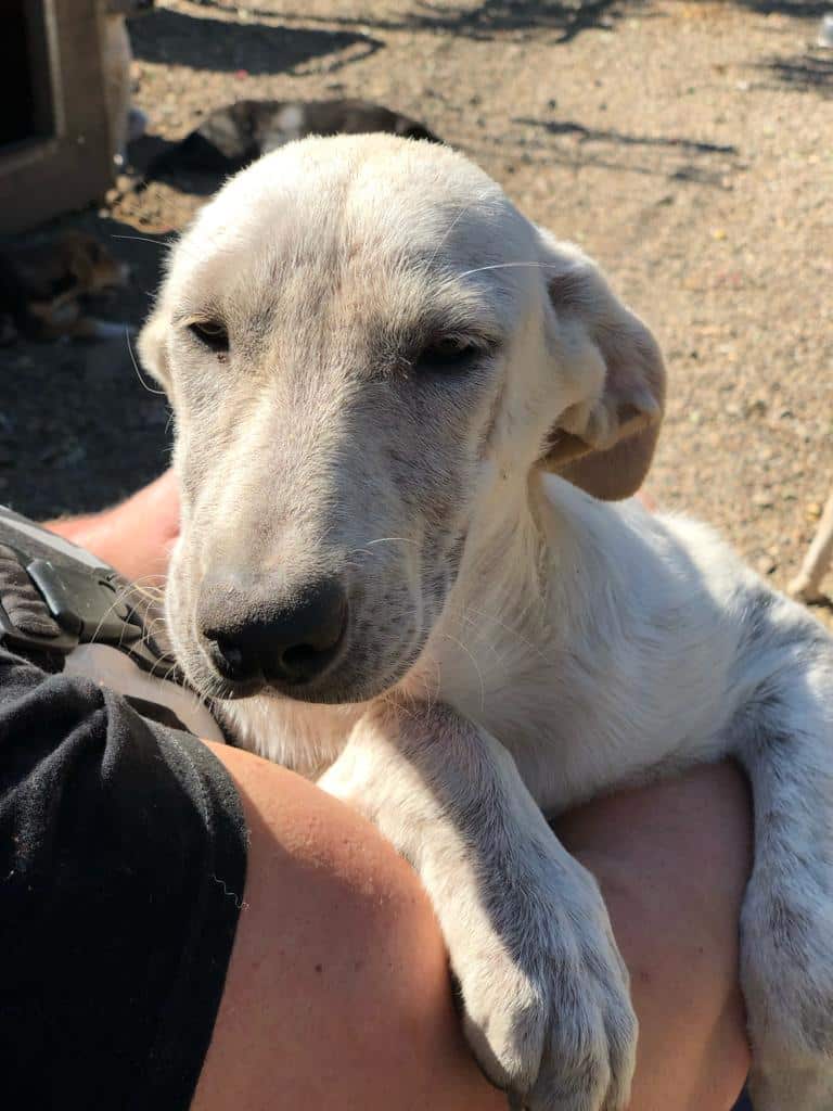 Update 10/23: Candy Girl leidet immer noch unter Hautproblemen. Nicht ungewöhnlich für einen weißen Hund mit kurzem Fell, aber dann noch Tag und Nacht diesen Wetterbedingungen ausgesetzt zu sein, wird trotz Behandlung eine vollständige Genesung nicht möglich sein. Wir suchen daher dringend einen Platz für unsere aktuell 5-6 Monat alte Hündin, die sich uns gegenüber offen und zutraulich zeigte. Der Winter wird zu hart für sie.