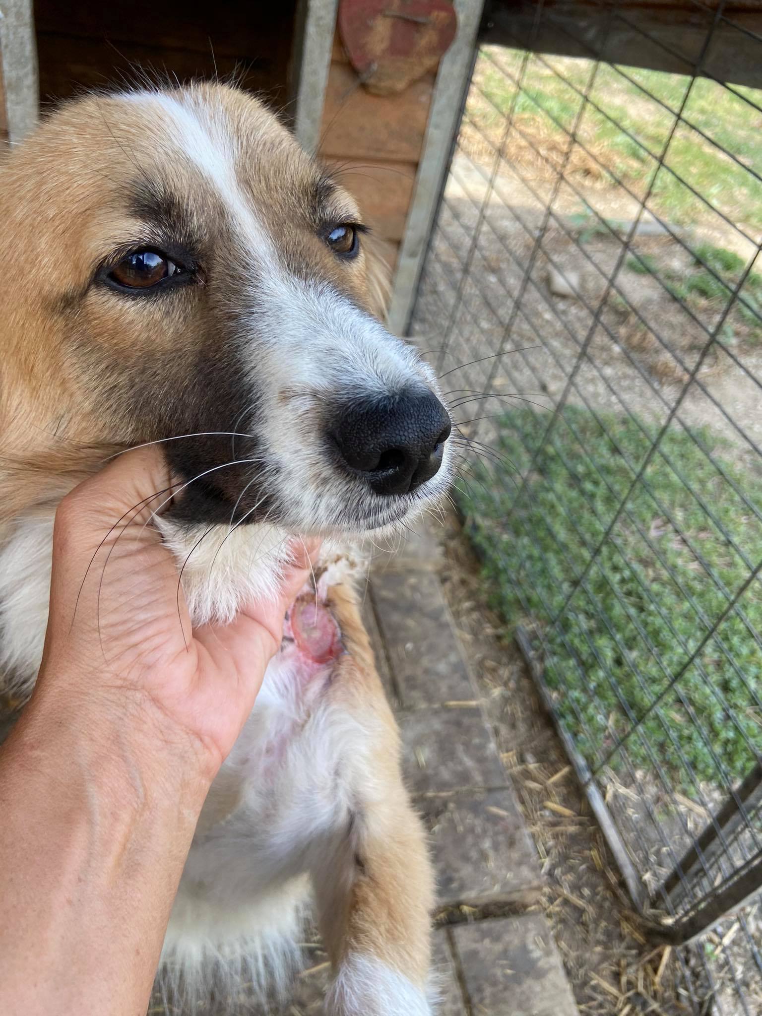 rechtes Vorderbein durch Beißattacke verloren, Wunde an linker Schulter (09/21)