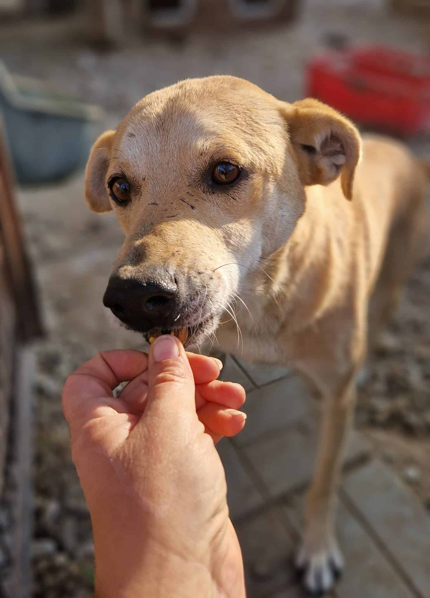 CAPPY nimmt super gerne Leckerchen aus der Hand. Es fehlt ihm nicht viel, um zu vertrauen.